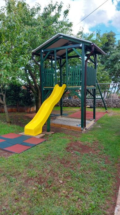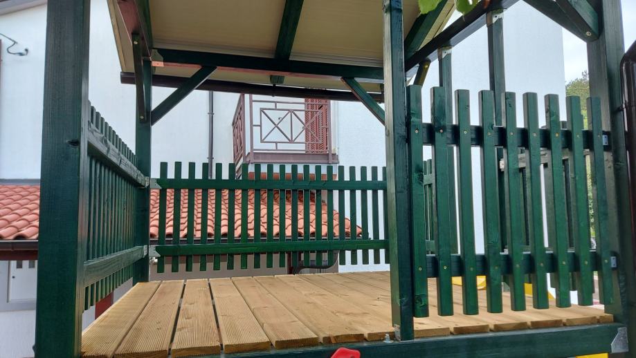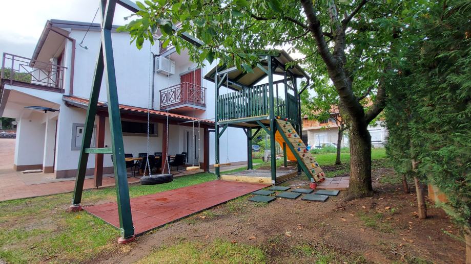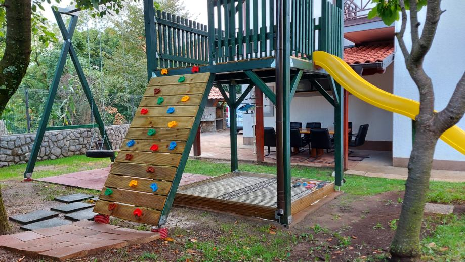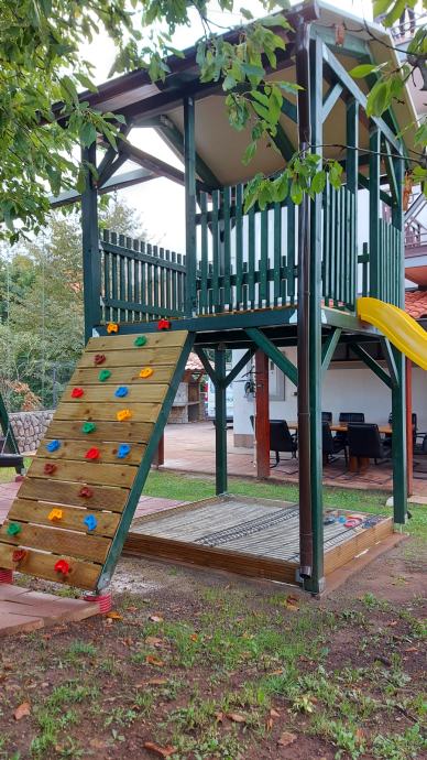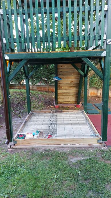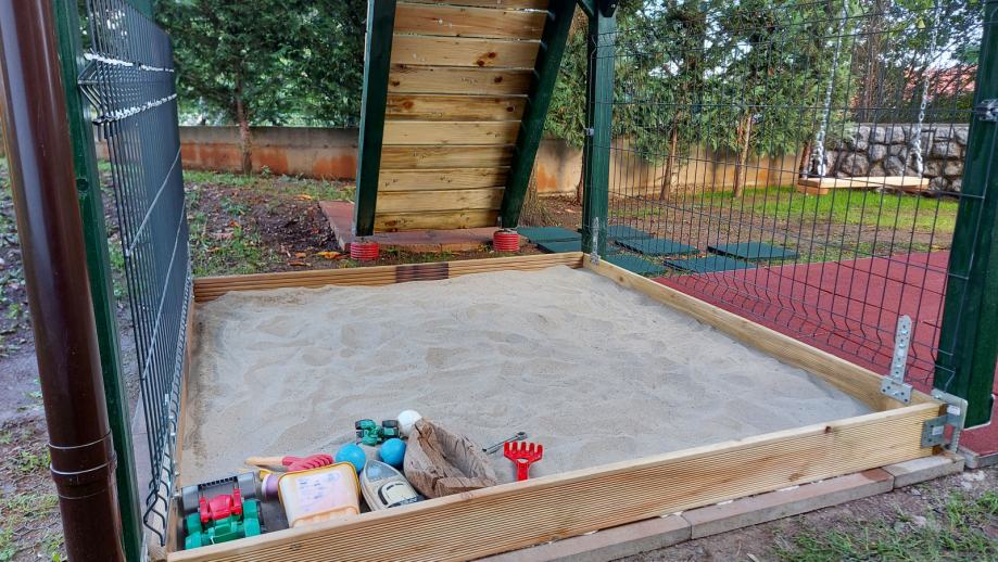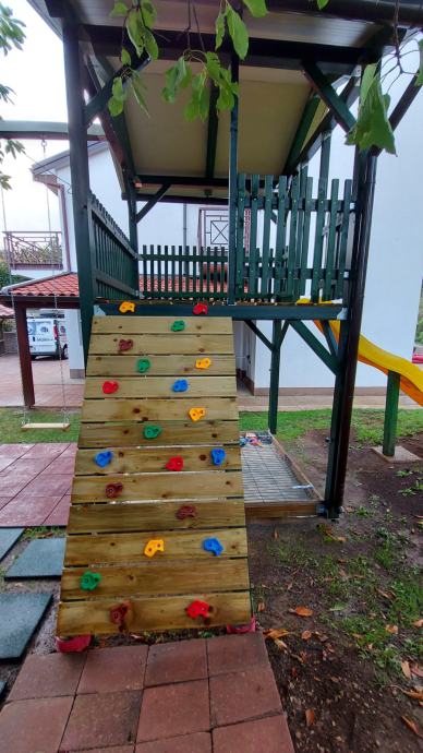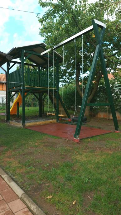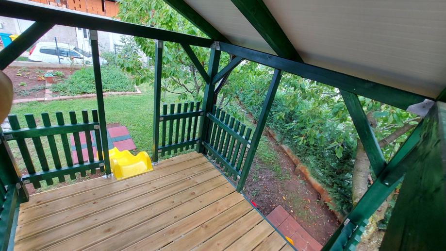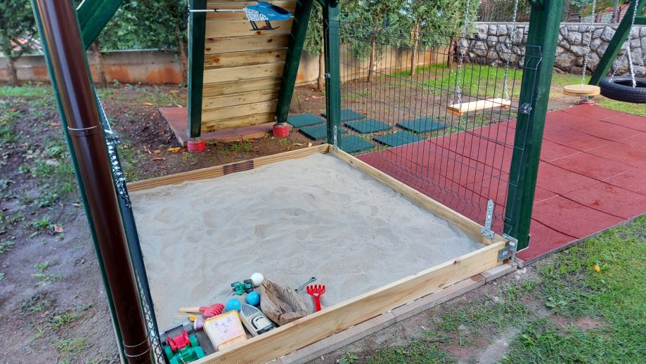 Igralište je ručni rad rađeno od jelovih greda 10x10, pod je rađen od kvalitetnih obrađenih obloga za terase.