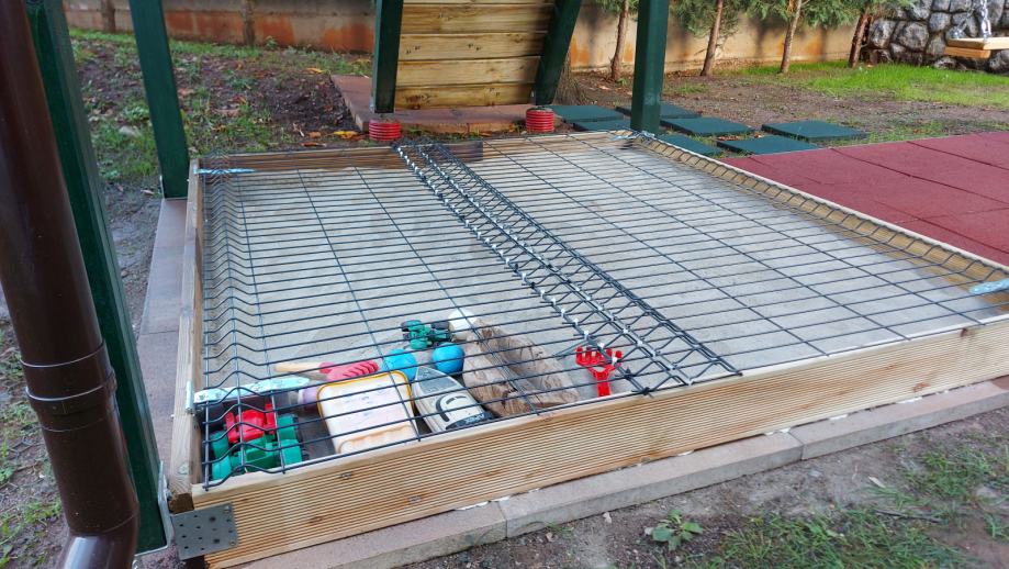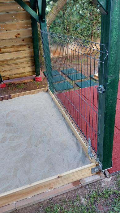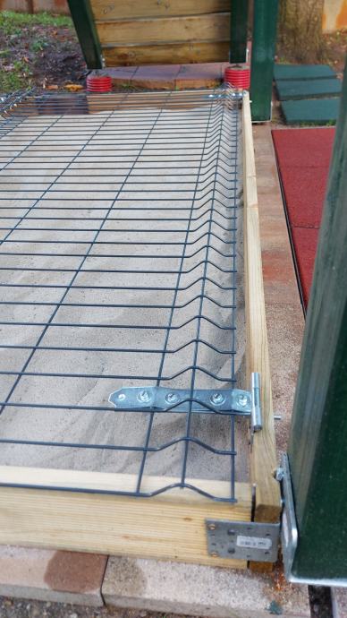 Na pješčaniku je zaštita od životinja (mačke i sl.) napravljeno od ogradnih panela i fiksirano na šarke radi jednostavnog podizanja i spuštanja sa prihvatima - držačima koji drže ogradu kada je podignuta.