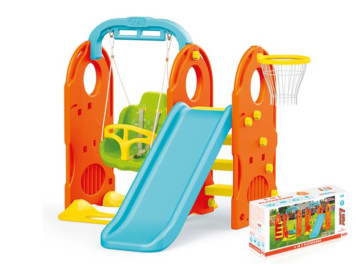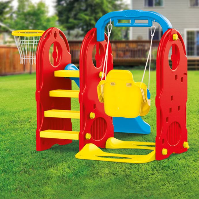 Igraonica za dvorište koja sadrži ljuljačku sa zaštitnim remenjem, tobogan za ludi spust i koš za timsku igru.