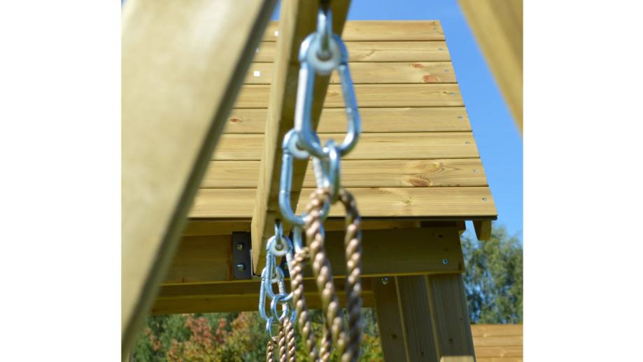 Sigurnost tornja osiguravaju grede debljine 44 x 69 mm. Osim stabilnosti igrališta, uključena su 4 komada željeznih sidara koja se ubacuju u tlo i pričvršćuju vijcima za drvene grede.