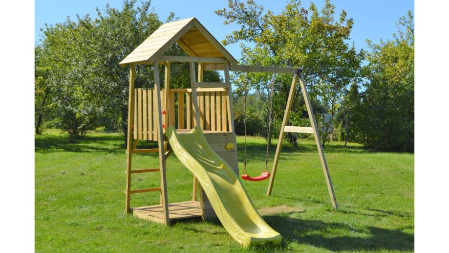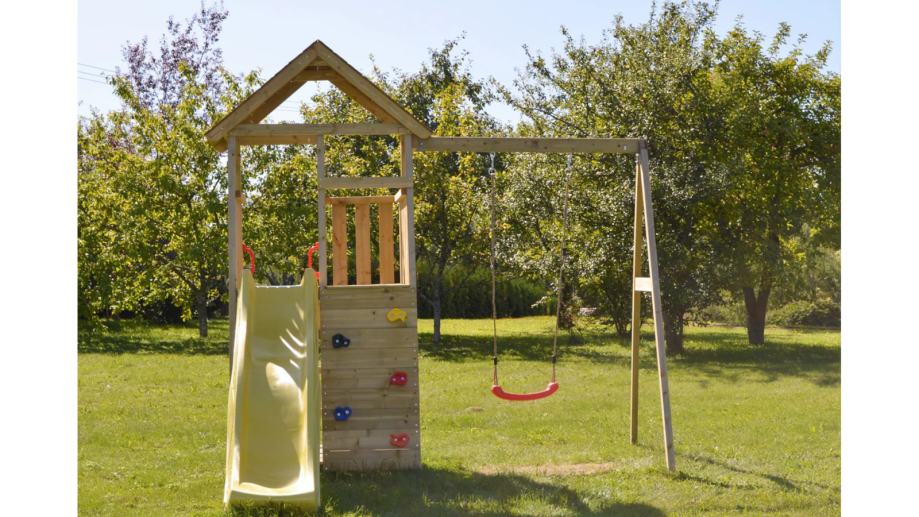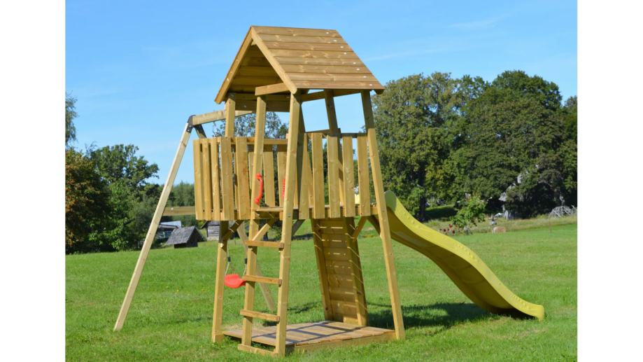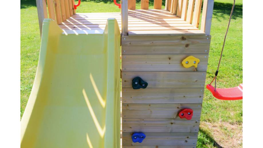 Djeca se mogu kretati, igrati i biti kreativna na svježem zraku na našem igralištu. Prilikom penjanja uz zid za penjanje, čak i mališani nadmašuju sami sebe i mogu se nagraditi nezaboravnom vožnjom niz tobogan dug 220 cm. Istovremeno, toranj za igru funkcionira kao malo skrovište ili utočište zahvaljujući krovu.
