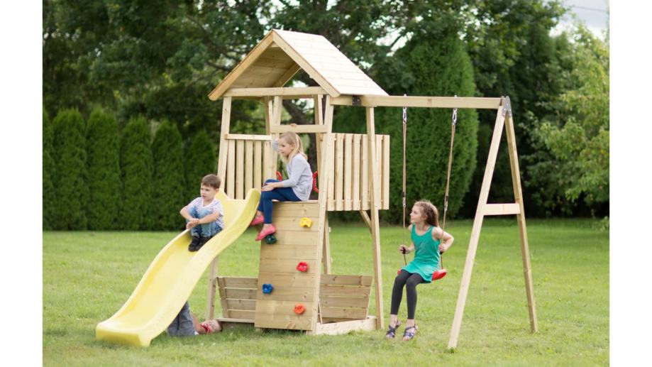 Junior serija kućnih igrališta s Play Towerom i mnogim dodacima namijenjena je mlađoj djeci od 4 do 10 godina. Play Tower ima platformu visoku 120 cm. Play Tower je igralište koje će obožavati cijela dječja ekipa! Očaravajuća kućica na stupovima s valovitim toboganom, zidom za penjanje i balkonom za skrivanje i igru pružit će vašoj djeci beskrajnu zabavu.