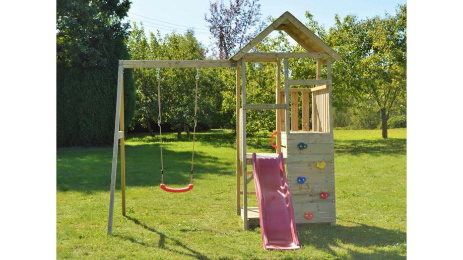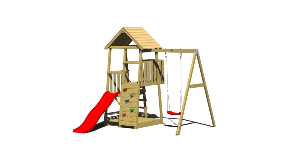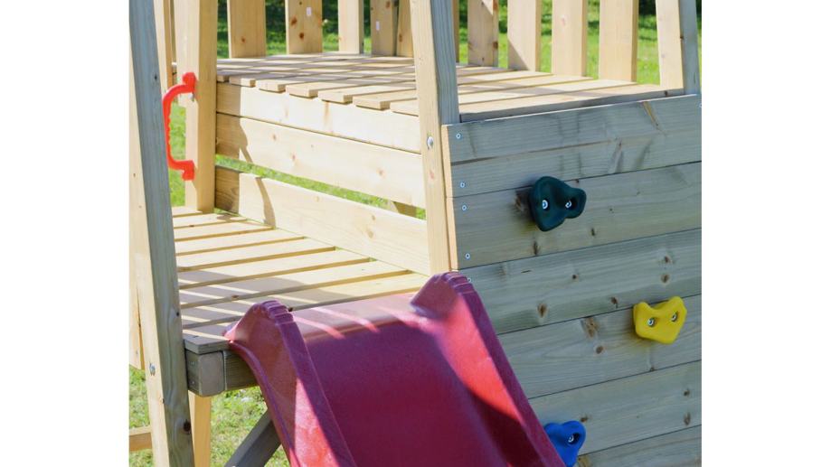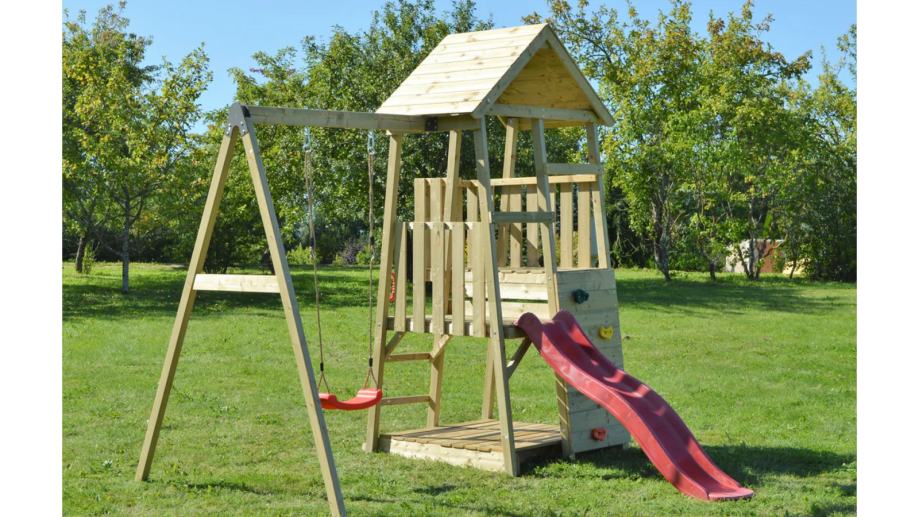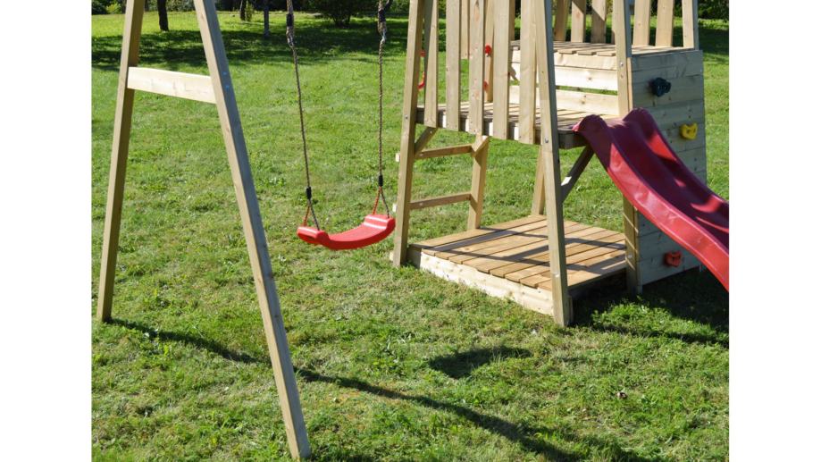 Djeca se mogu kretati, igrati i biti kreativna na svježem zraku na našem igralištu. Prilikom penjanja uz zid za penjanje, čak i mališani nadmašuju sami sebe i mogu se nagraditi nezaboravnom vožnjom niz tobogan dug 175 cm. Istovremeno, toranj za igru funkcionira kao malo skrovište ili utočište zahvaljujući krovu. Ispod tornja nalazi se ugrađeni pješčanik s poklopcima koji se mogu zatvoriti nakon igre, osiguravajući da je pijesak suh i čist. Dodatnu zabavu i adrenalin pružit će ljuljačke s jednom sjedalom, koje su pričvršćene sa strane tornja.