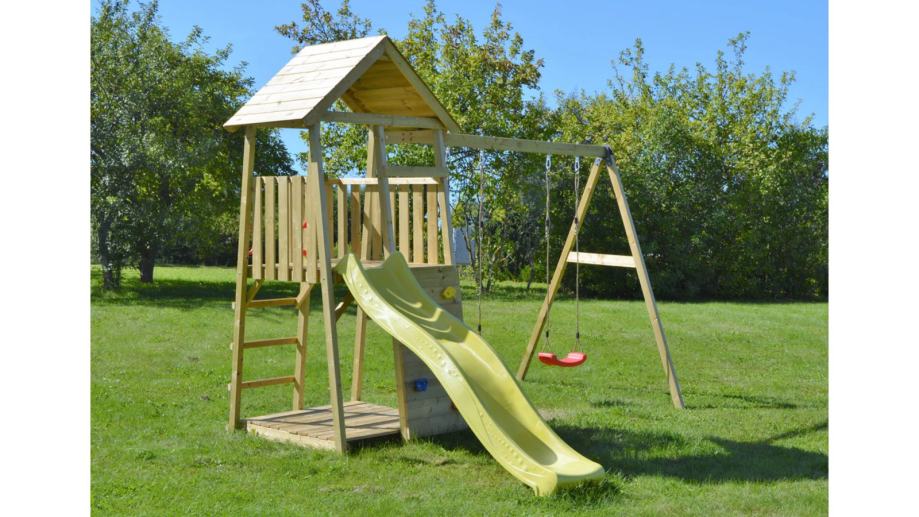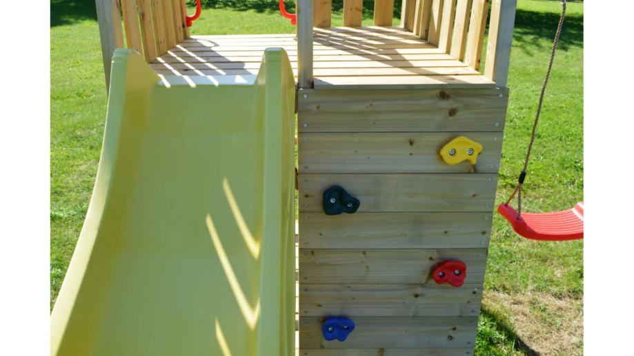 Djeca se mogu kretati, igrati i biti kreativna na svježem zraku na našem igralištu. Prilikom penjanja uz zid za penjanje, čak i mališani nadmašuju sami sebe i mogu se nagraditi nezaboravnom vožnjom niz tobogan dug 220 cm. Istovremeno, toranj za igru funkcionira kao malo skrovište ili utočište zahvaljujući krovu.