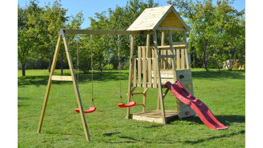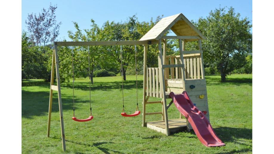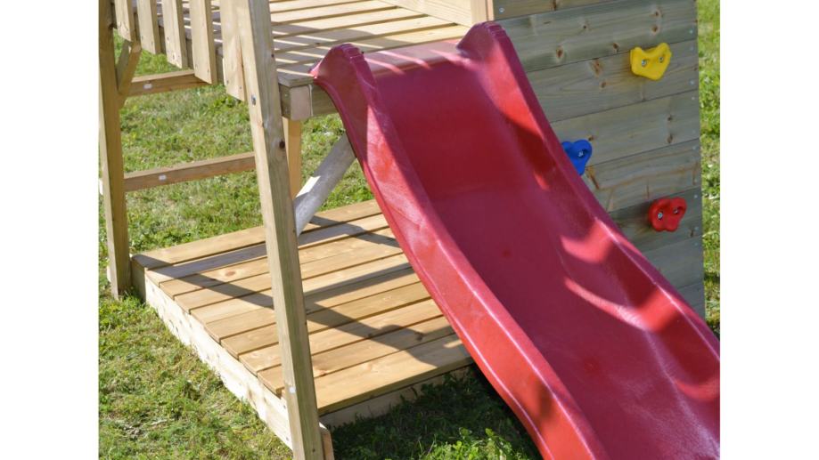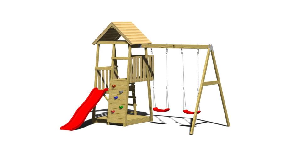 Djeca se mogu kretati, igrati i biti kreativna na svježem zraku na našem igralištu. Prilikom penjanja uz zid za penjanje, čak i mališani nadmašuju sami sebe i mogu se nagraditi nezaboravnom vožnjom niz tobogan dug 175 cm. Istovremeno, toranj za igru funkcionira kao malo skrovište ili utočište zahvaljujući krovu. Ispod tornja nalazi se ugrađeni pješčanik s poklopcima koji se mogu zatvoriti nakon igre, osiguravajući da je pijesak suh i čist. Dodatnu zabavu i adrenalin pružit će dvostruke ljuljačke koje su pričvršćene sa strane tornja.