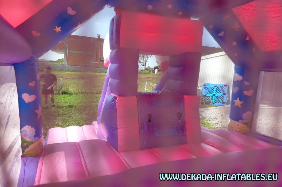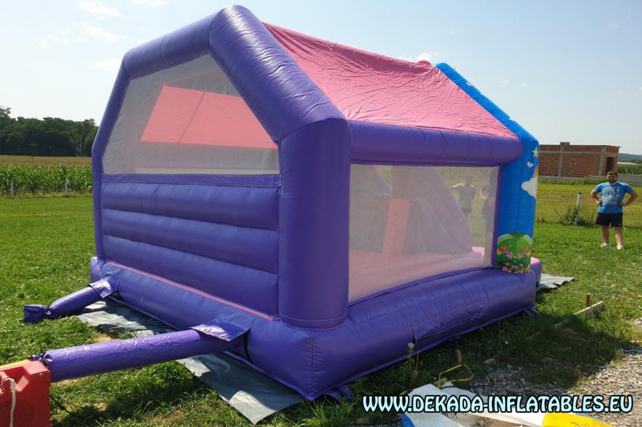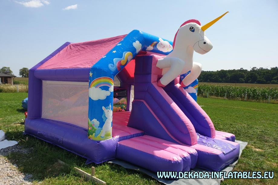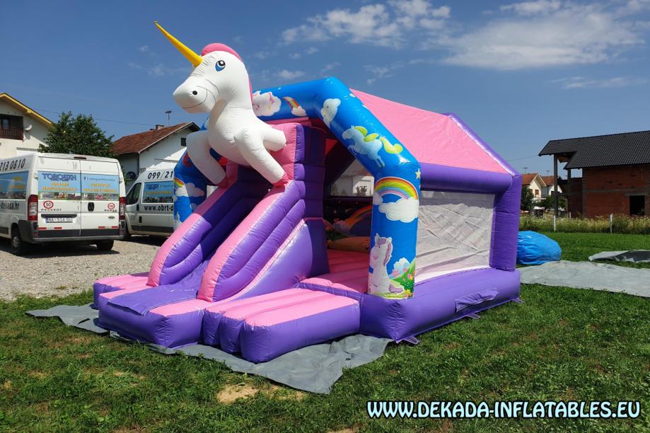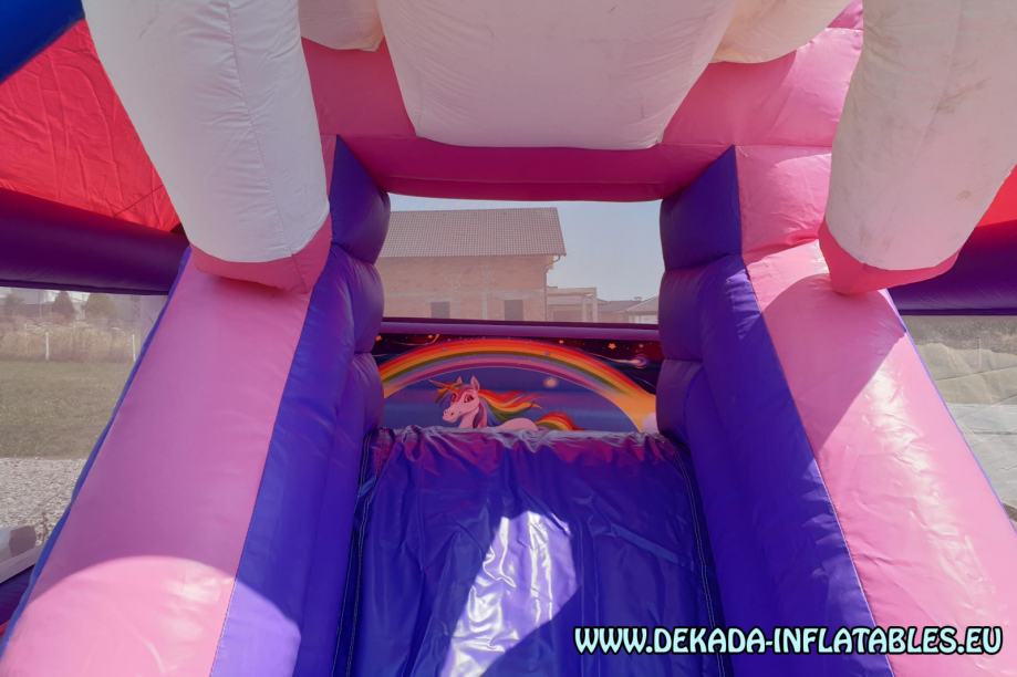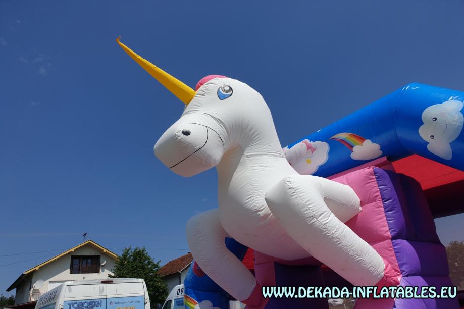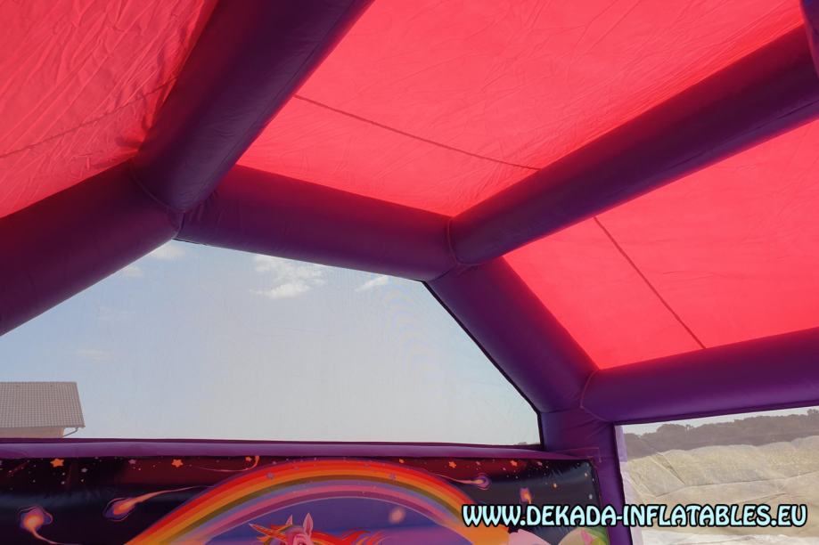 Igraonica na napuhavanje s motivom jednoroga. Nova, nekorištena. Dolazi s prikladnom puhalicom. Natkriven