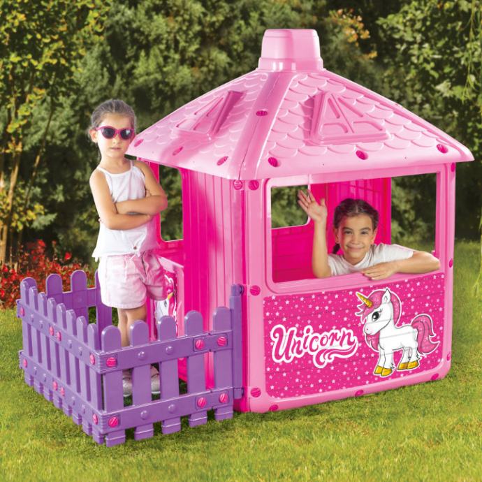 Zaigrajte se u kući ili na dvorištu u ovoj kućici Jednorog roze boje.