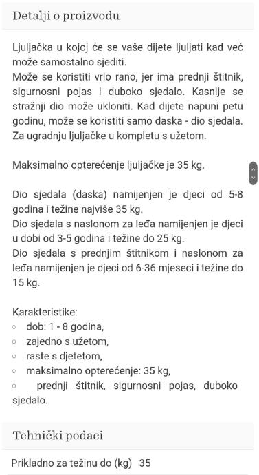 Može se koristiti vrlo rano jer ima prednji štitnik, sigurnosni pojas i duboko sjedalo. Kasnije se prerasli dijelovi mogu ukloniti; kad dijete napuni petu godinu, može se koristiti samo donji dio za sjedenje.