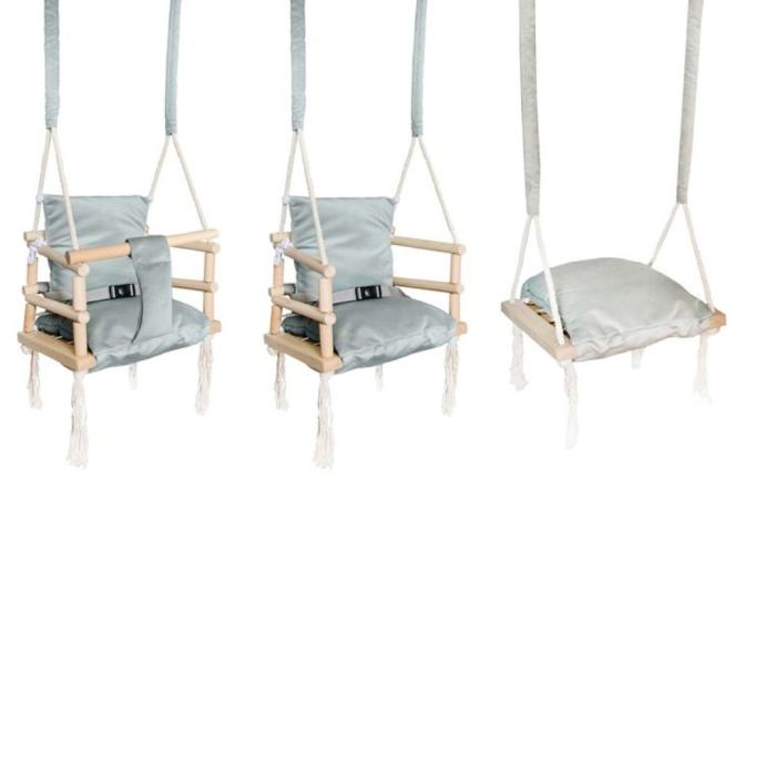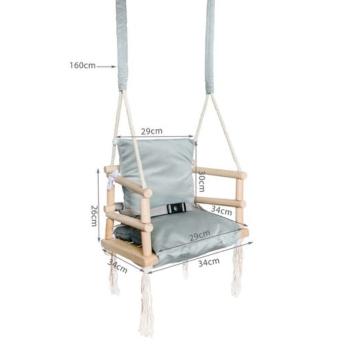 Potpuno je sigurna za dijete s zaobljenim rubovima i precizno ispolirana. Drveni elementi su izrađeni od borovog drva, pružajući čvrstoću i izdržljivost. Mogućnost skidanja materijalnih dijelova ljuljačke olakšava održavanje higijene, brinući se o zdravlju vašeg mališana.