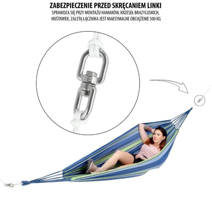 Okretni nastavak - karabiner za sprječavanje uvijanja i okretanja užeta od zamaha. Možete ga koristiti i za vješanje viseće mreže. Može nositi čak 500 kg.Materijal: čelikMaksimalna nosivost: 500 kgDuljina: 88 mmRazmak rupa: 20 mmTežina: 103g