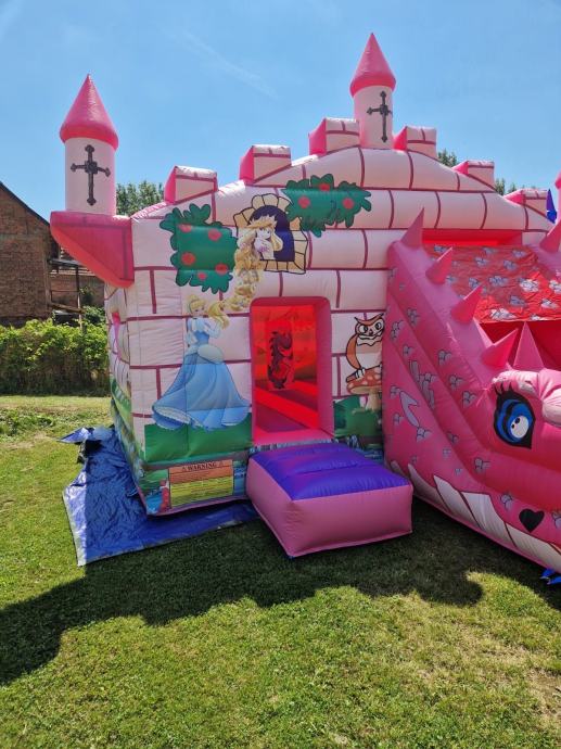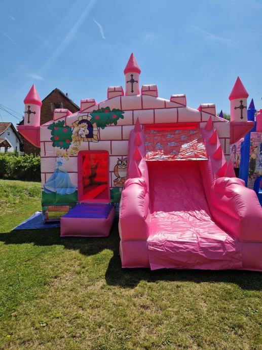 Prodajem napuhanac u obliku dvorca princeze u ružičastoj boji. Radi se o većem napuhancu koji uključuje prostor za skakanje te tobogan. Izvana je ukrašen motivima princeza, a unutra ima nekoliko prepreka za dodatnu zabavu. Napuhanac je kao novi.