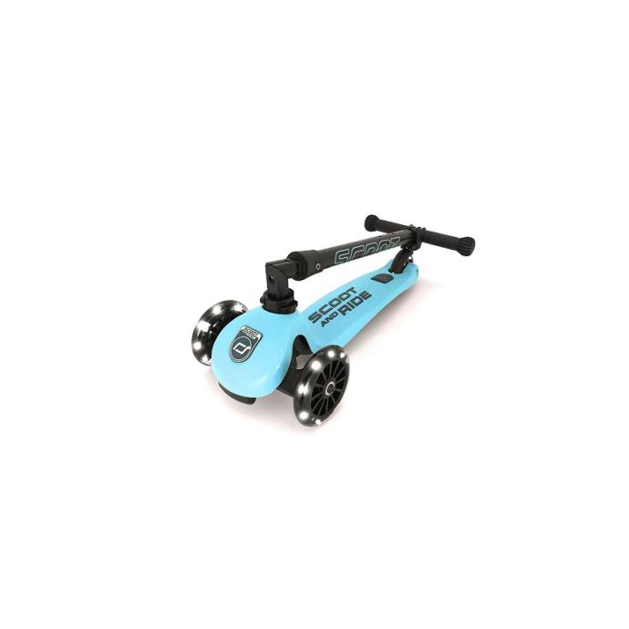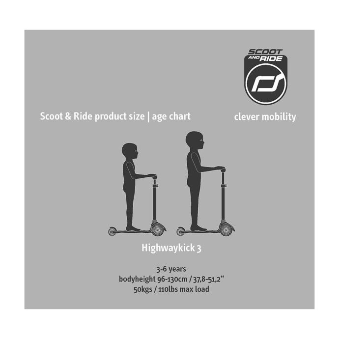 Scoot & Ride Highwaykick romobil s LED svjetlima u kotačima - maksimalna zabava za vaše dijete. Osigurava maksimalnu stabilnost pomoću dva prednja kotača kao zaštite od prevrtanja te niskim položajem postolja. Podesiva i sklopiva šipka ručke poboljšava rukovanje i omogućuje jednostavno skladištenje i nošenje proizvoda. Ručica podesiva prema potrebi i visini djeteta između 62 i 82cm. Osim standardno rukama i upravljačem, dijete može i djelomičnim naginjanjem tijela skretati i prolaziti kroz zavoje čime dodatno razvijaju osjećaj ravnoteže i koordinacije.