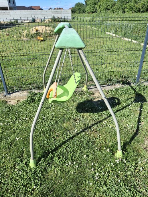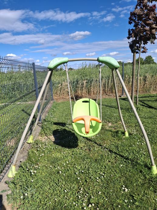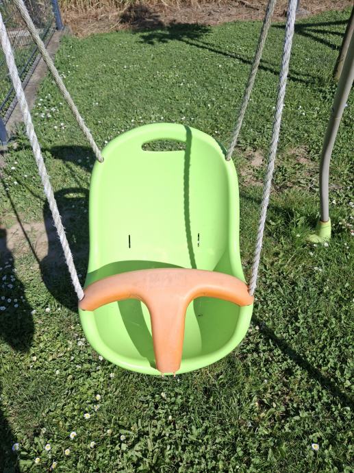Samostojeća ljuljačka, vrlo malo korištena, za unutarnju ili vanjsku upotrebu. Do 15 kg. Ima prednji štitnik koji se može podići i sigurnosni pojas. Nema nikakvih oštećenja, potpuno je ispravna