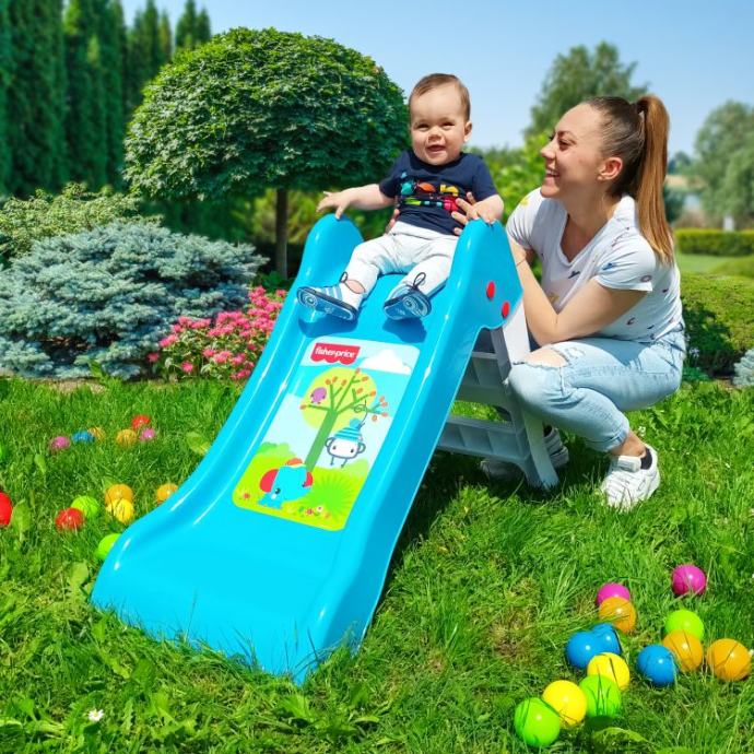 Plavi tobogan poznatog proizvođača Fisher Price idealne je veličine za korištenje u kući ili na otvorenom. Napravite pravi mali dječji zabavni park uz Bima igračke za dvorište.