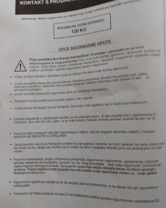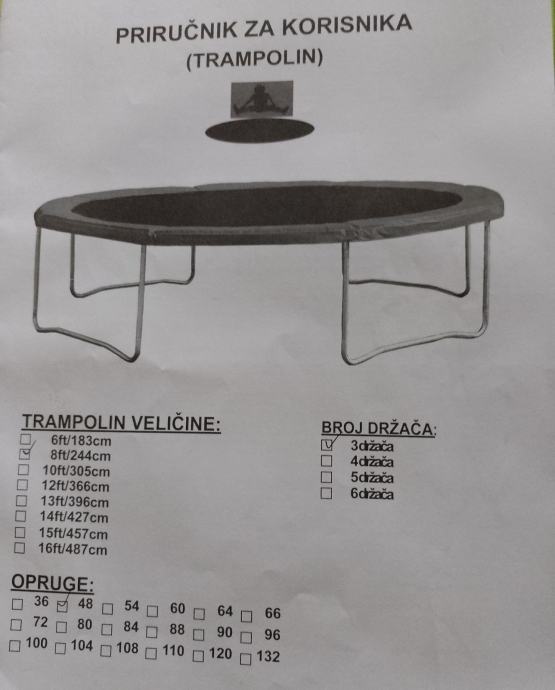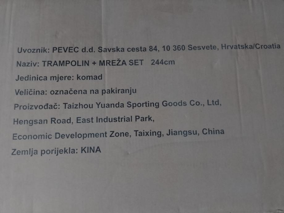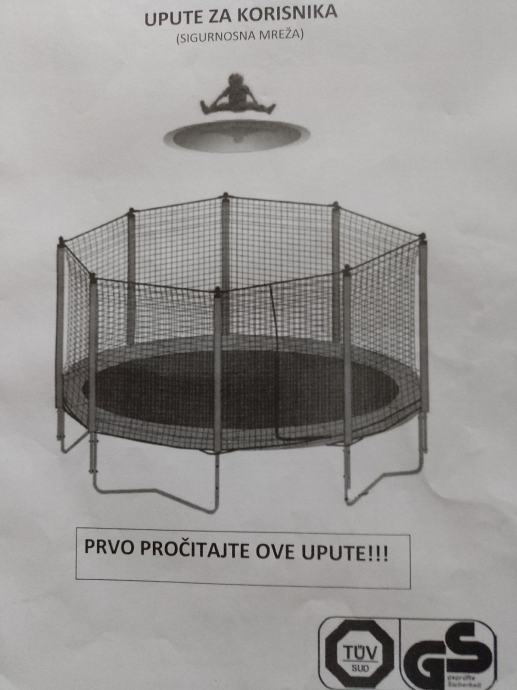 Trampolin širine 244 cm, nosivosti do 120 kg, cijelo vrijeme u garaži, s uputama, prodajem za 100,00 € ili mjenjam za ražanj za peći prasce !! Moguća dostava, u bližoj okolici, nakon uplate iznosa !!