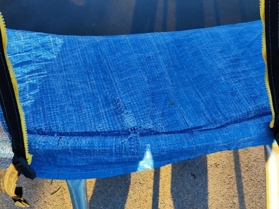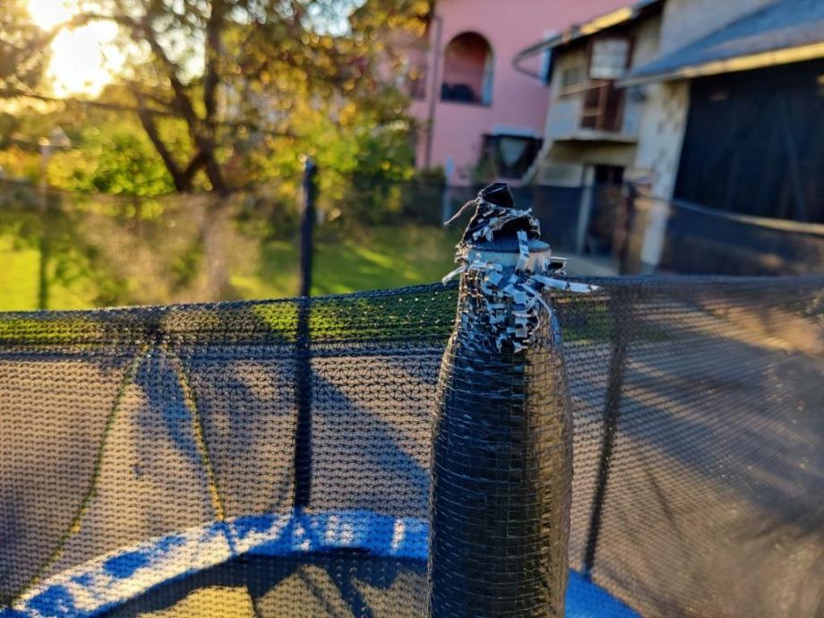 Korišten jedno ljetno razdoblje (2022), manja oštećenja cerade na stupovima (vidi foto), ne utječe na sigurnost i ispravnost trampolina.