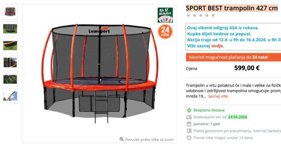 Trampolin je star 4 godine ali korišten samo 3 ljeta i pažljivo zapakiran. Sve u dobrom stanju. Cijena novog je sada 599 eura. U ponudi za preuzimanje u Vinkovcima po 179 Eura u originalnim kutijama.