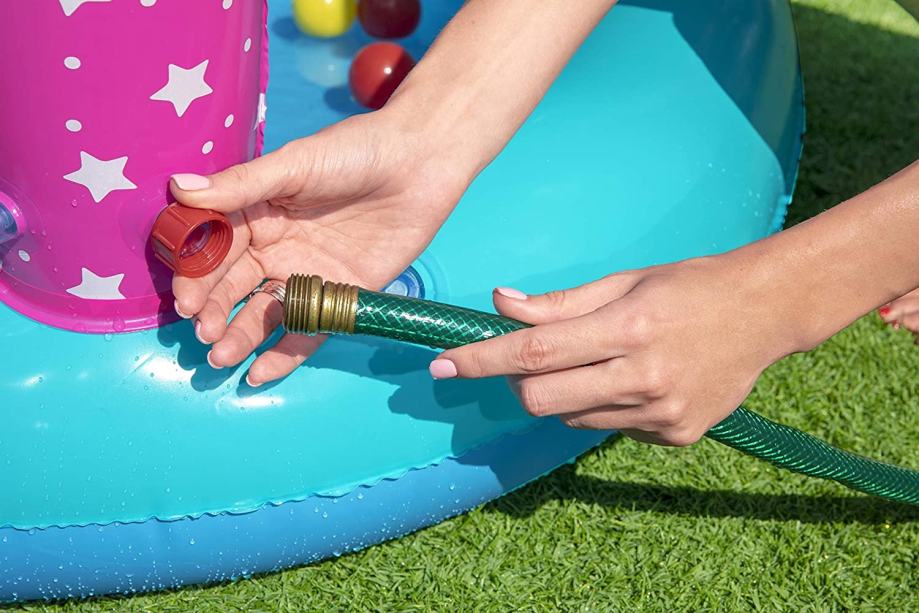 Sadržaj paketa: Centar za igru od izdržljivog vinila 0,27 / 0,17 mm: Bazenčić Tobogan Obruč na napuhavanje u obliku zvijezde, Čarobni štapić na napuhavanje, Šest loptica za igru, Zakrpa za popravak