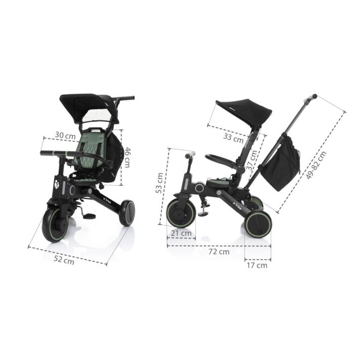 Naslon za leđa, odvojive pedale, uklonjivi krović, vožnja prema naprijed i unatrag, sigurnosni pojas u 5 točaka, jednostavno sklapanje – sve su karakteristike X Trike tricikla.