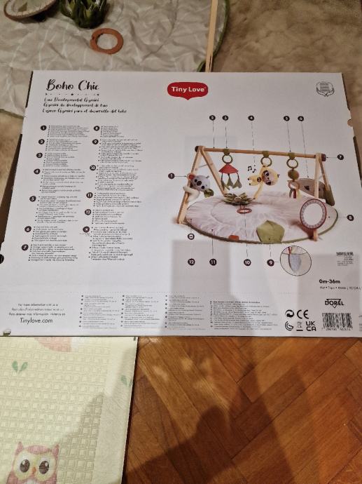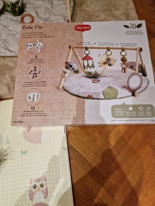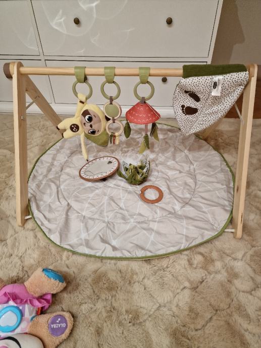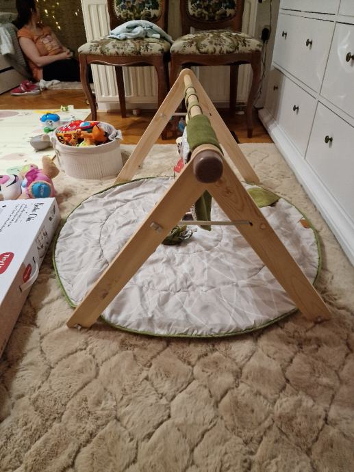 Dvostruko podstavljena meka podloga za aktivnosti izrađena je od vrhunskih tkanina i kombinirana je s prirodnim drvenim lukom za igru opremljenim preslatkim visećim igračkama.