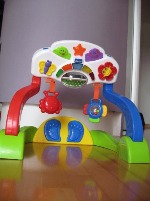 Nogicama može da dodiruje stopice na donjem djelu igračke i proizvodi zvukove (jedna pedala trubi, a druga zvoni), zvečke aktiviraju različite melodije, oblici na ploči također proizvode zvukove i melodije.