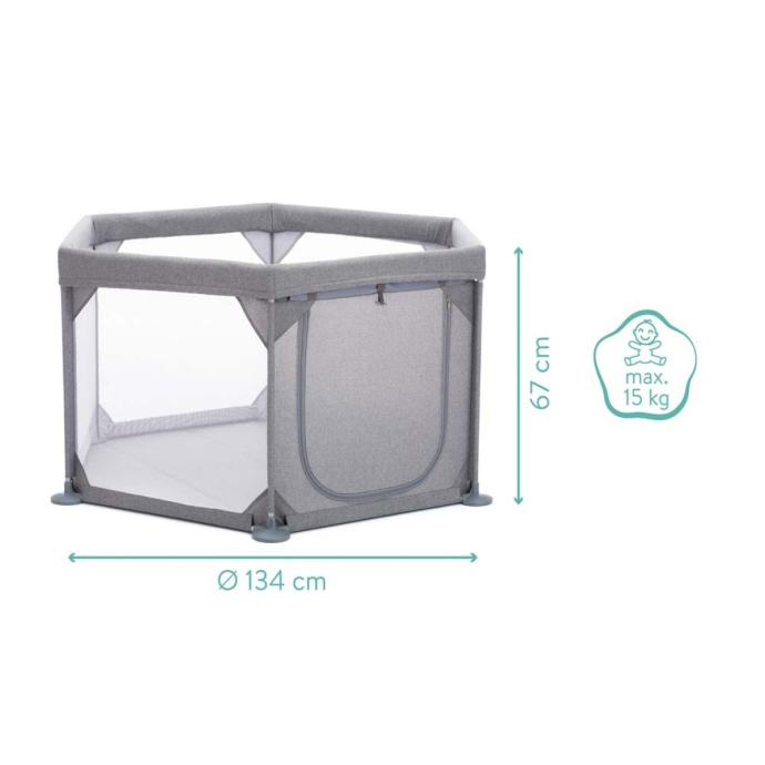 Igraonica se može lako sastaviti uz pomoću šipki koje su sama konstrukcija igraonice. Uz transportnu torbu možete ju vrlo jednostavno spakirati i nositi posvuda, kako bi se Vaša beba uvijek mogla sigurno igrati u njemu. Kada se ne koristi, vrlo lako se može sklopiti bez demontaže, kako bi zauzimala malo mjesta.