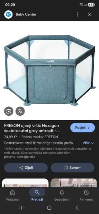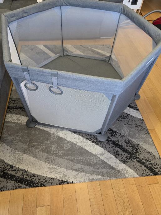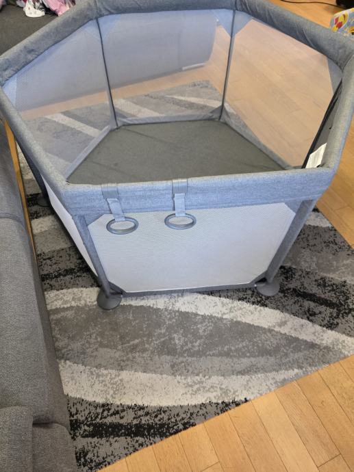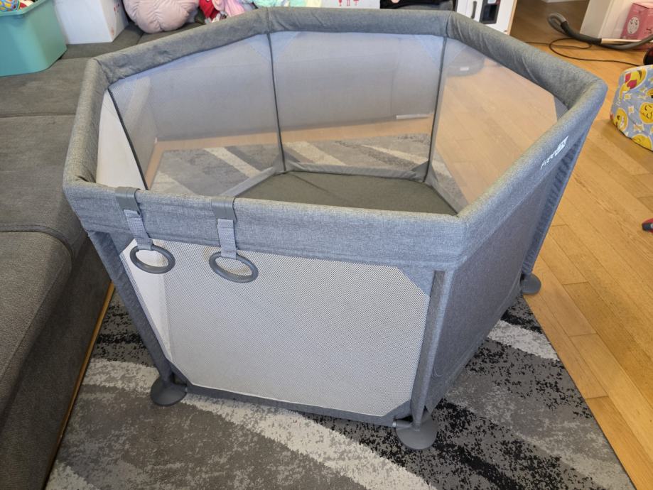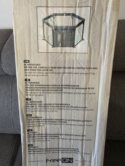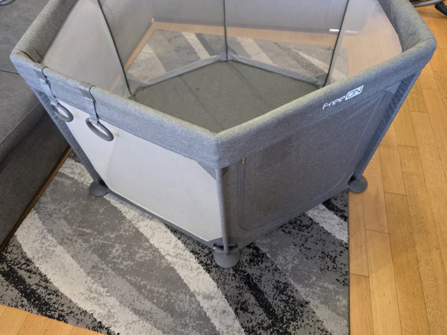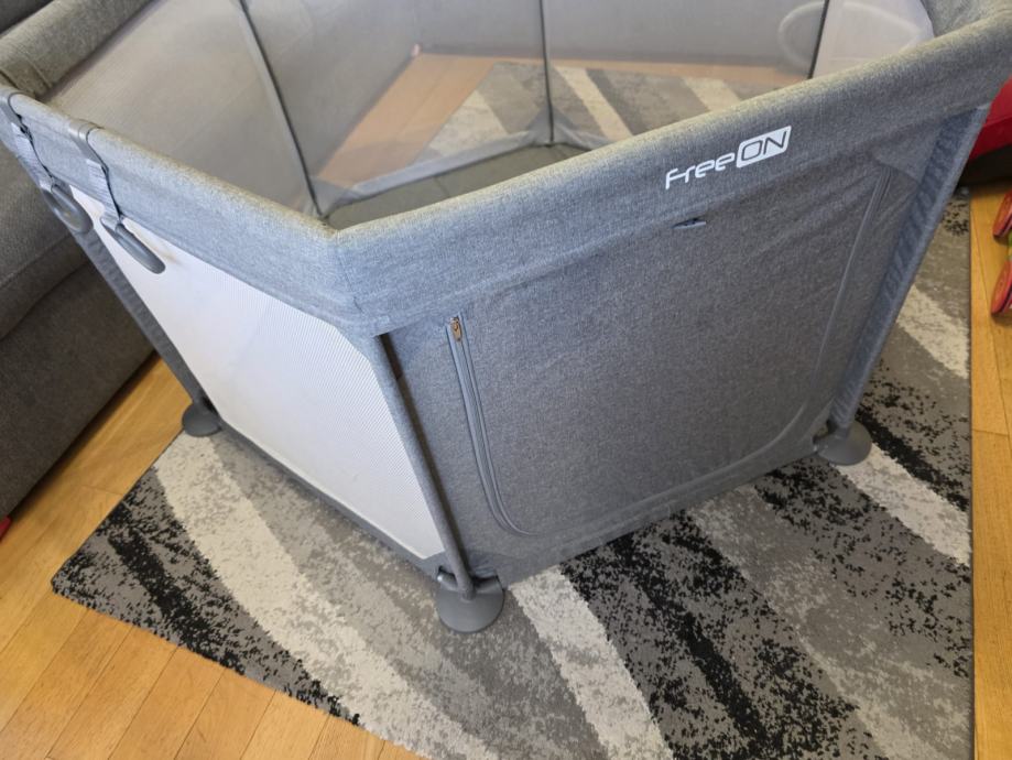 Prodaje se dječji vrtić marke FreeON. Korišten minimalno i dobro očuvan. Ima cif koji omogućuje da se može otvoriti i zatvoriti. Dolazi rastavljen i s kutijom. Vrlo lako sastavljanje. Platneni dio je opran i čist. Moze se prati u perilici na niskoj temperaturi. Ima jednu ogrebotinicu vidljivu na slici, jedva primjetna, ali slikano da se vidi.