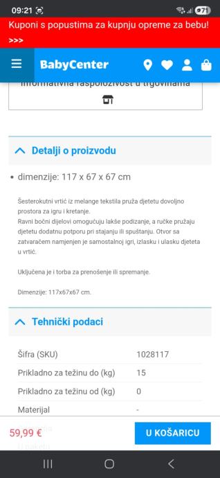 Dimenzije vidljive na slici. Nije prevelik i taman za manje prostore. U kompletu dolaze i ručke koje bebi olakšavaju dizanje i stajanje tijekom faze prohodavanja.