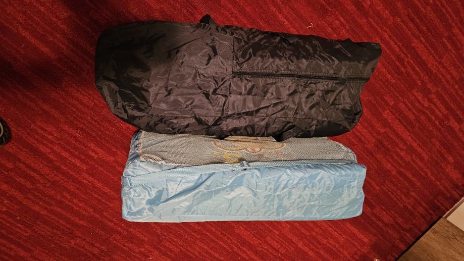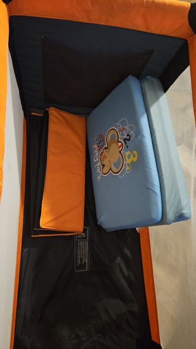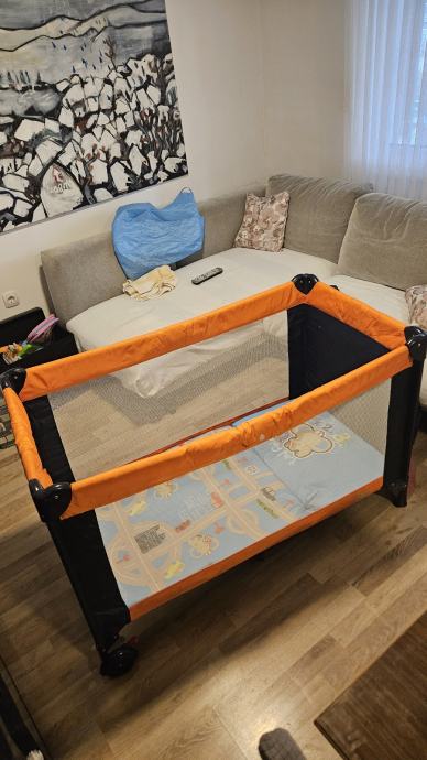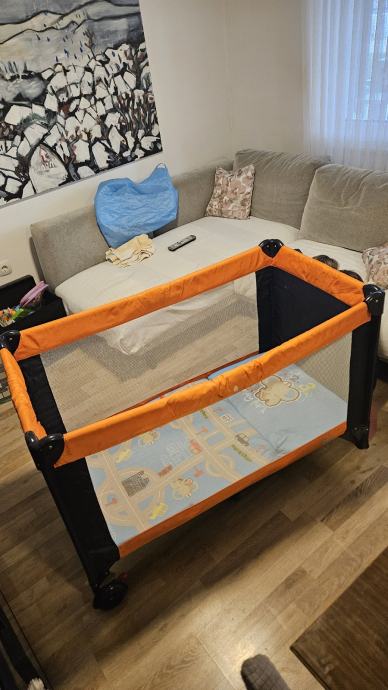 Putni krevetić / vrtić. Sastoji se od konstrukcije, narančaste podloge i podnice sa motivom grada / autostaze.