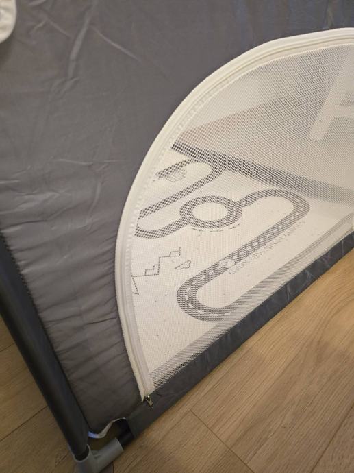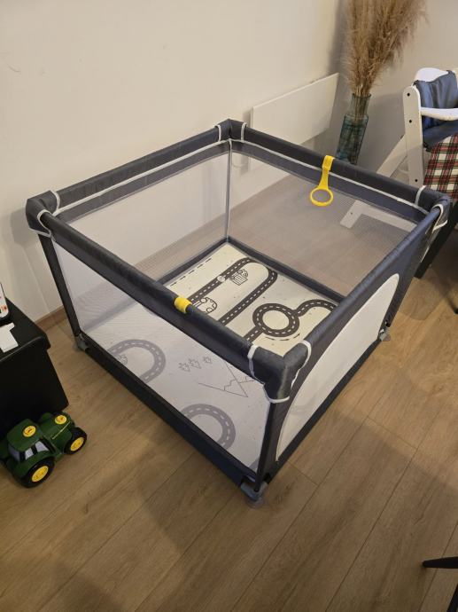 Vrtic za bebe 90x90, sivi, sa prozirnim djelovima, sarenim madracem na podlozi i mogucnoscu otvaranja jedne strane za ulaz i izlaz. Kupljen prosle godine, koristen za jedno dijete.