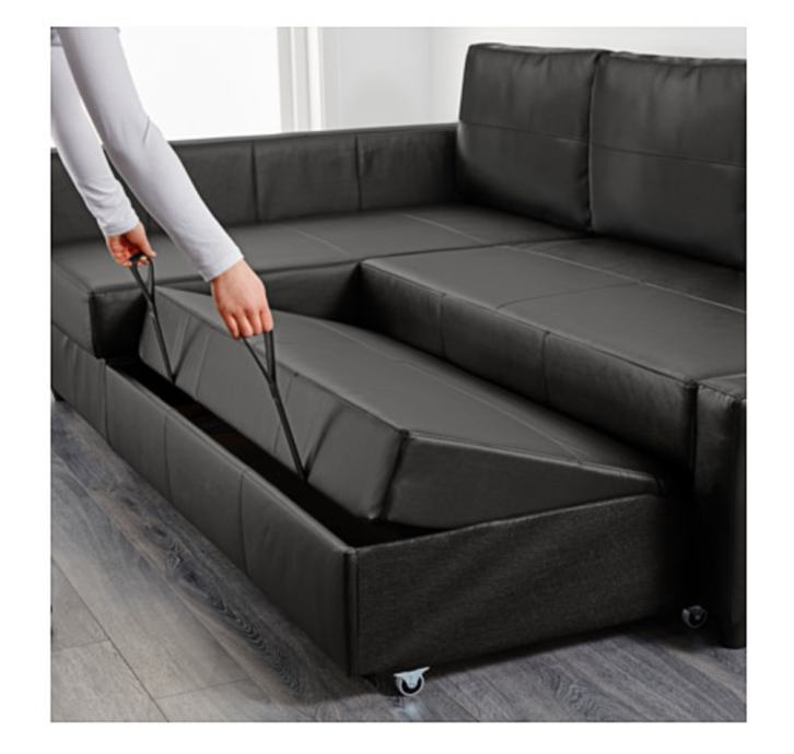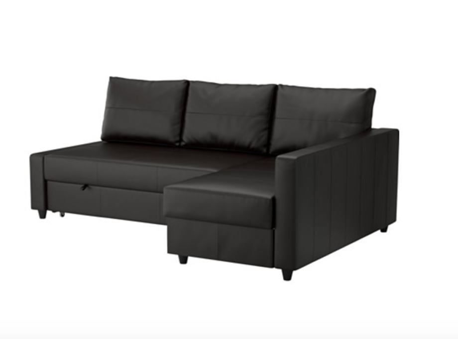 Prodaje se "FRIHETEN" kutna sofa na razvlačenje (crna Boomstad varijanta) kupljena u IKEI prije godinu dana, odlično očuvana i specifična po tome što dok se razvuče, razvučeni dio ima mekani madrac u sebi a ne samo tvrdo drvo i spužvu kao inače - prema tome je dosta pogodan kao dugotrajni bračni krevet. Razlog prodaje je preseljenje u drugi stan u kojem već postoji namještaj. Materijal je umjetna koža i vrlo lako je za održavanje.