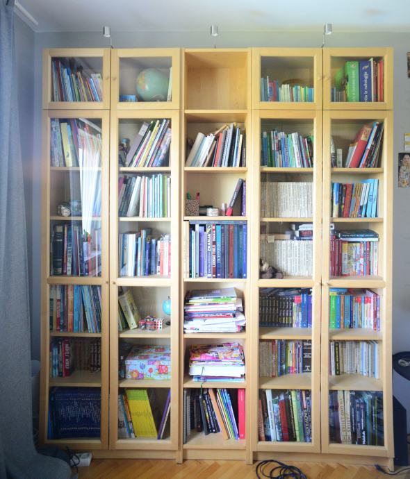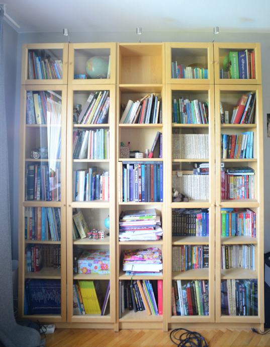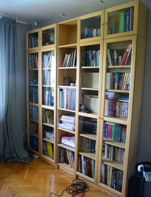 IKEA Billy biblioteku s Oxberg vratima, kao na slici, prodajem. Kombinaciju biblioteke čine dva Billy regala s vratima, u brezovom furniru, dimenzija 80x30x237 cm svaki te Billy biblioteka, otvorena, brezov furnir 40x28x237 cm.