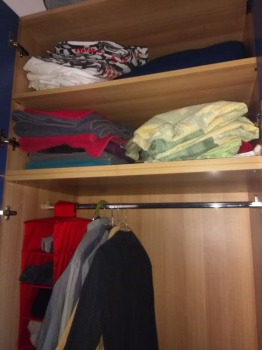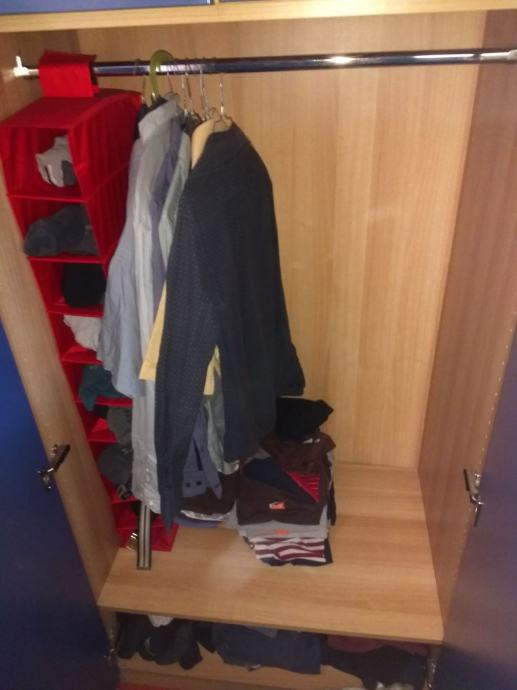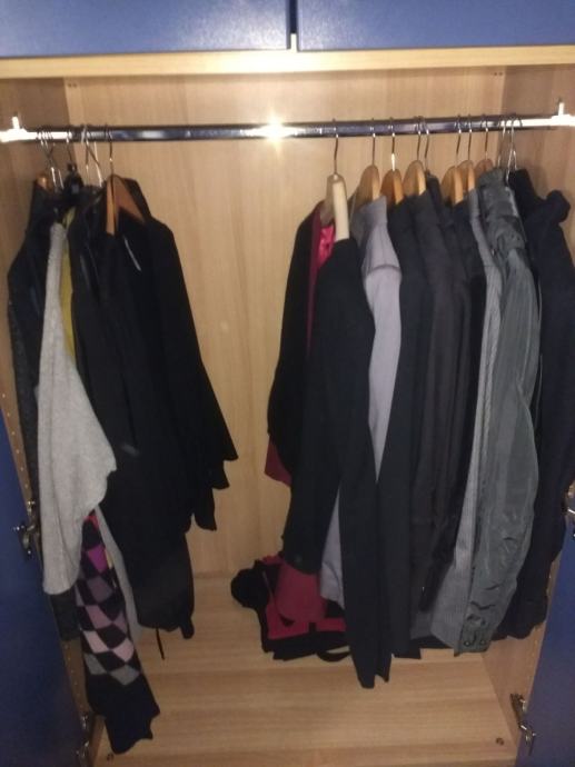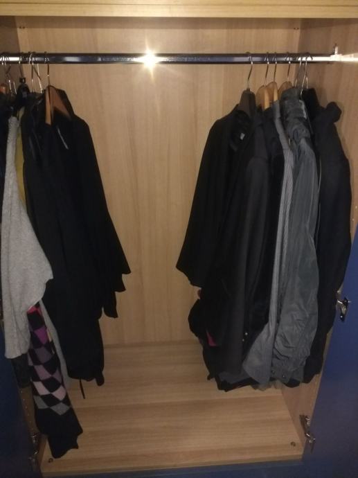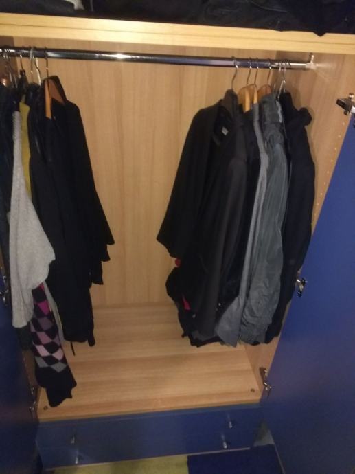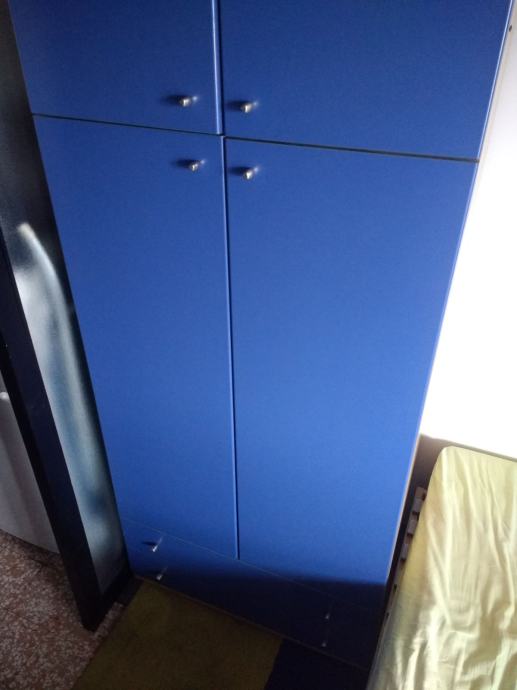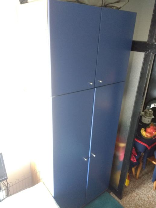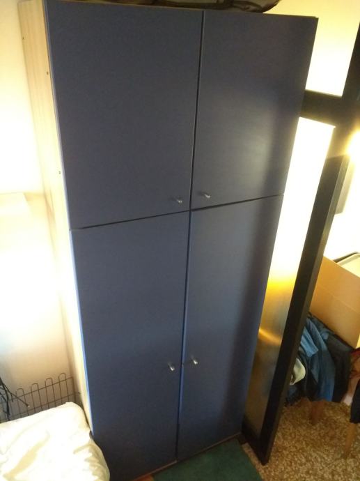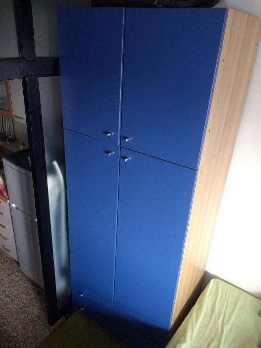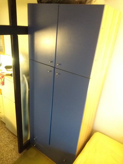Dva ormara, plavo lice i stranice od svijetlog drveta. Jedan na dnu ima dvije ladice, drugi nema, ali su na njihovu mjestu dvije police. Visina 230, širina 90, dubina 60 cm. 200 kn svaki.