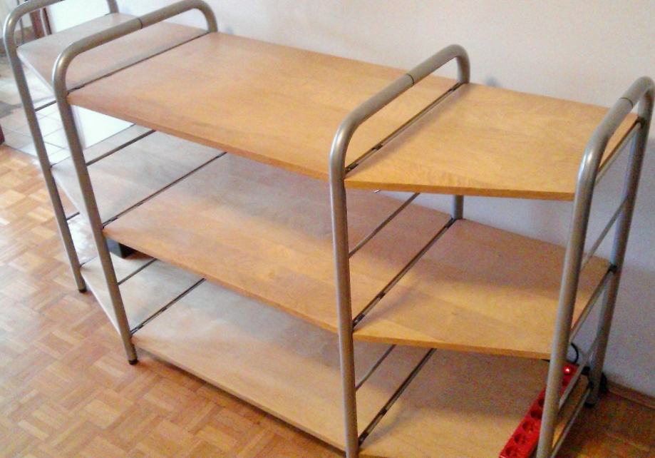 Čvrsta i obilata prostorom za odlaganje. Drvene ploče (police) od čvrstog punog drva. Nosači od metala mat srebrne boje.