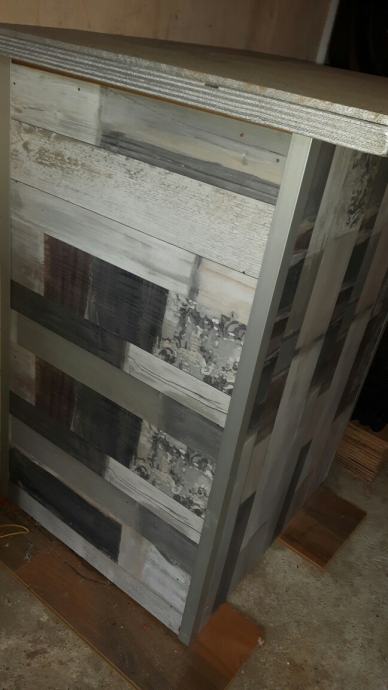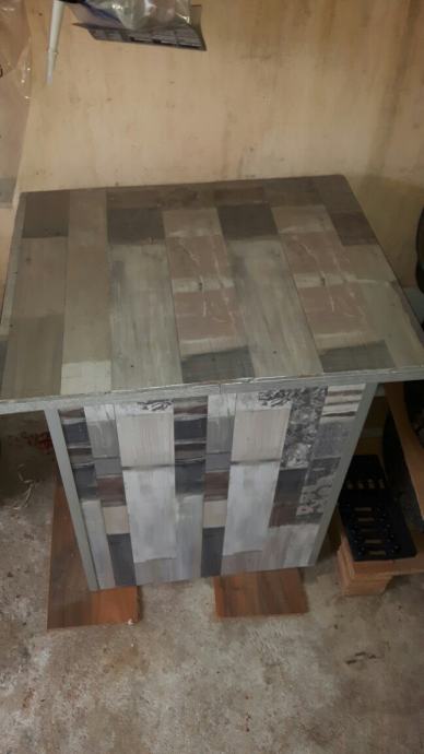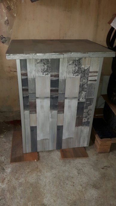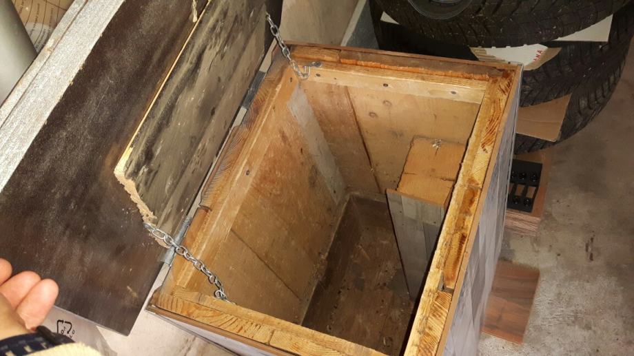 Izrazito jaka kutija za drva.Dno kutije je od stare ladice punog drveta te na nju izrađen šarafljenjem kostur od jelovih dasaka i na taj zaštičen lakiran drveni dio dekorativno stavljen laminat izvana,na uglovima stavljene lajsne(samo laminat koštao 30eu )Kutija ima poklopac koji je na dva panta i lančići na kojima poklopac stoji kad se podigne.Vanjske dimenzije kutije su:visina 76cm .dubina 42cm .širina 52cm