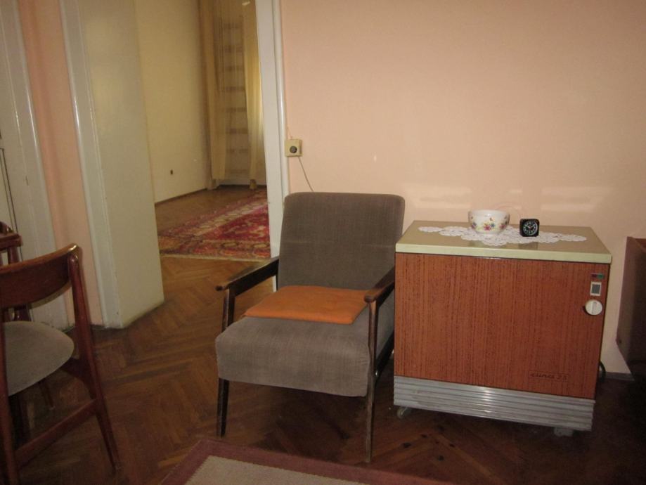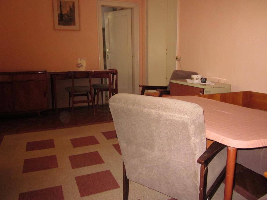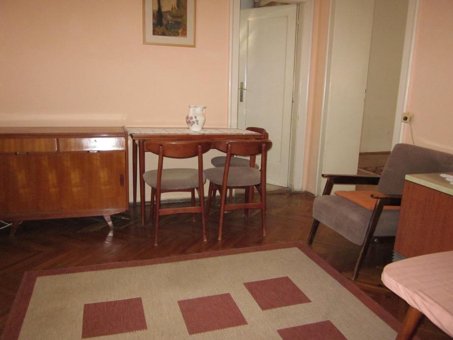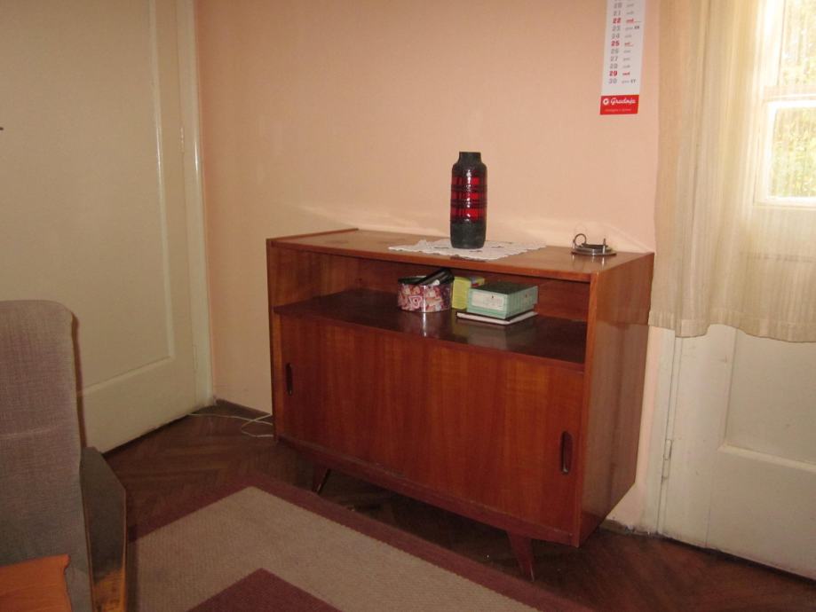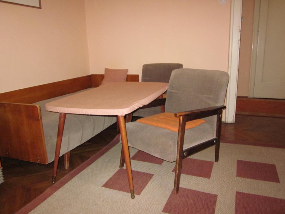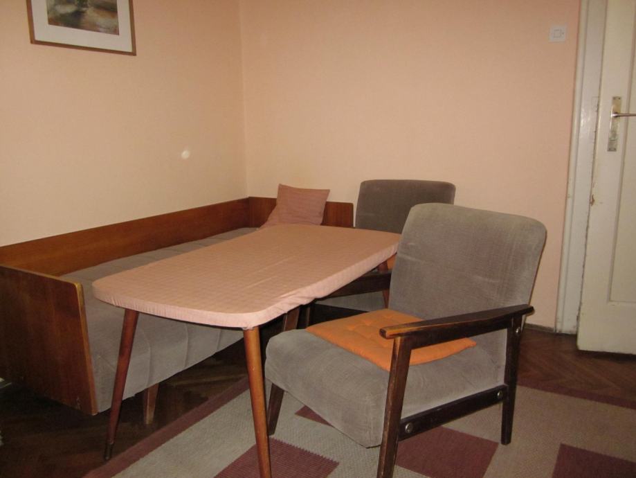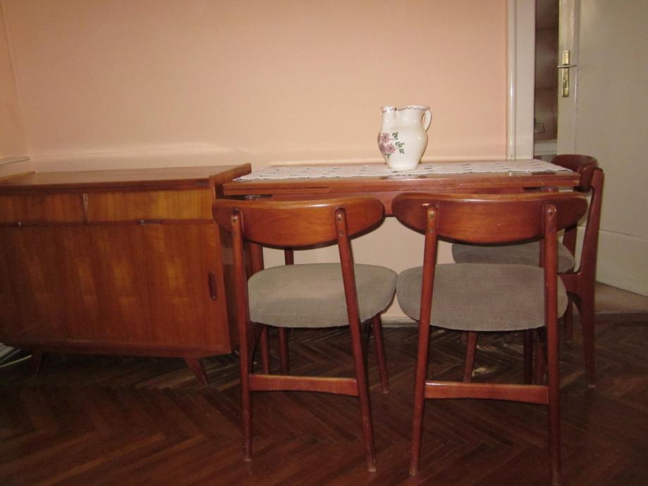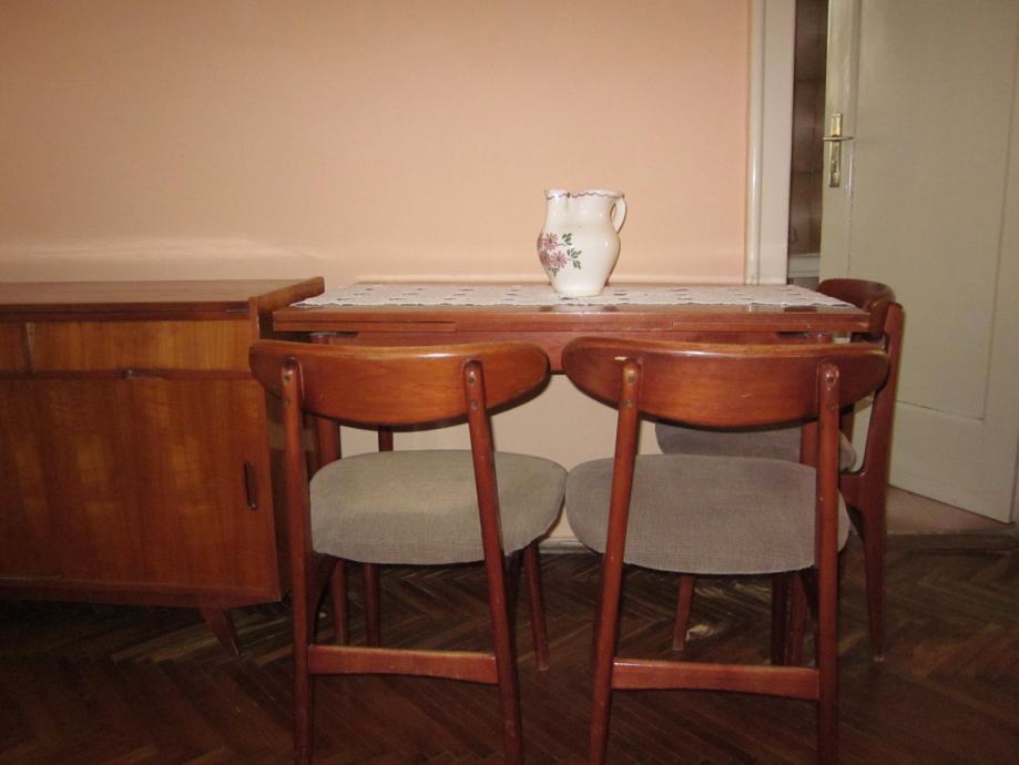 Prodajem drveni stol na razvlačenje sa pripadajuće 4 tapecirane stolice, kauč, 2 komode, te niži drveni stolić sa dvije tapecirane fotelje. Sav namještaj je izrađen od identičnog materijala, tako da može činiti kompletni dnevni boravak sa blagovaoničnim dijelom. Namještaj je stariji, ali je uredan i u dobrom stanju, a pretapeciran je prije cca 5 godina. U cijeni su i pripadajući tepih i luster. Sve na slikama.