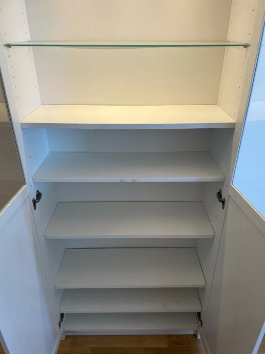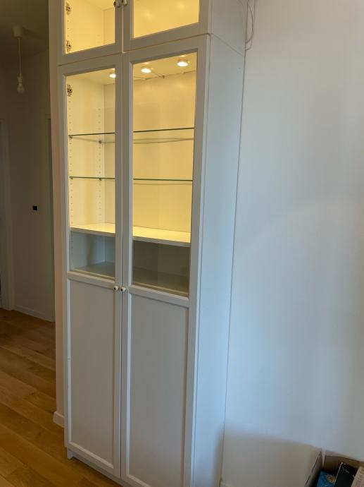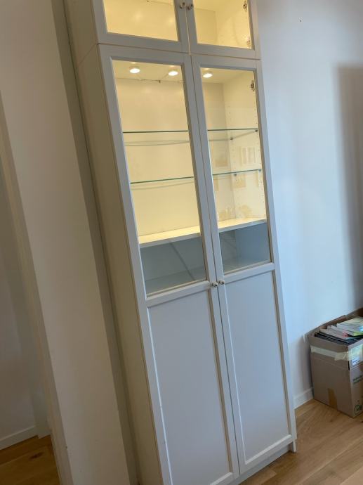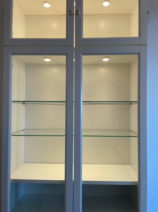 Prekrasan bijeli ormar s ugrađenim svjetlima. Kombinacija staklenih i drvenih polica. v 202 cm, š 80 cm, d 28 cm plus gornji dio v 30 cm.