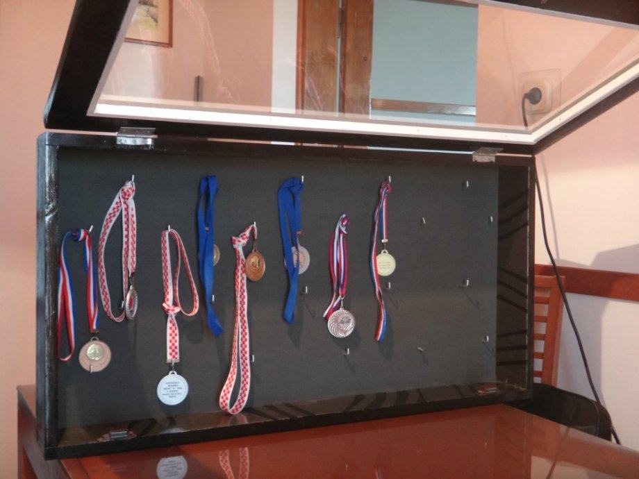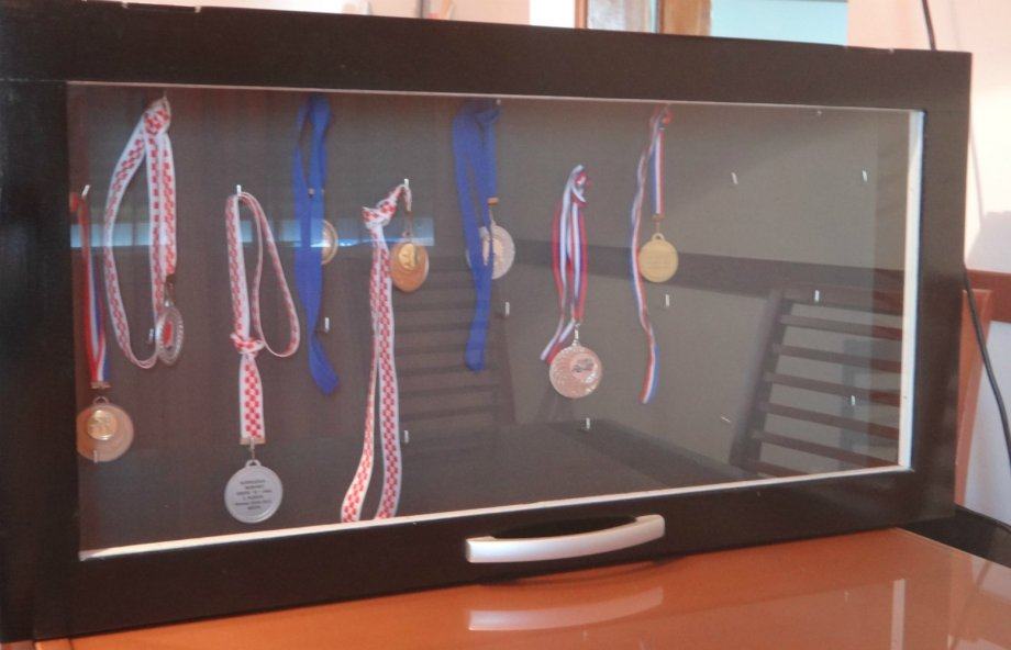 Prodajem drvenu policu za medalje modernog dizajna, crne boje, može se kombinirati vodoravno ili okomito.