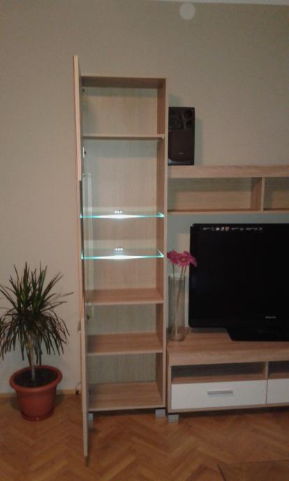 Visoki element sa jednim vratima, u kombinaciji staklo + MDF (unutra 2 staklene police sa led osvjetljenjem + 4 drvene police);
