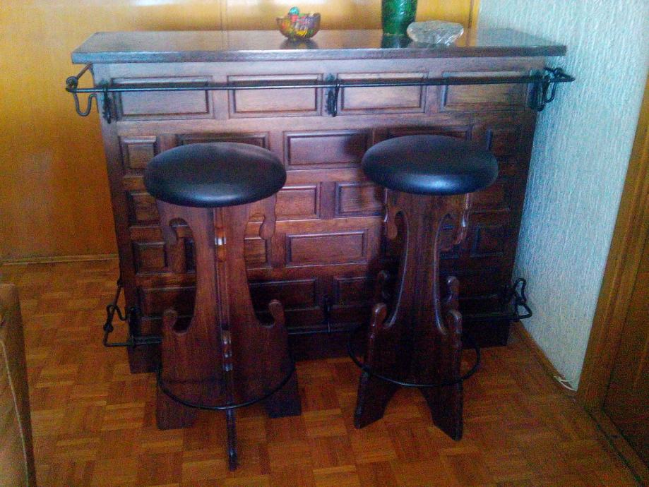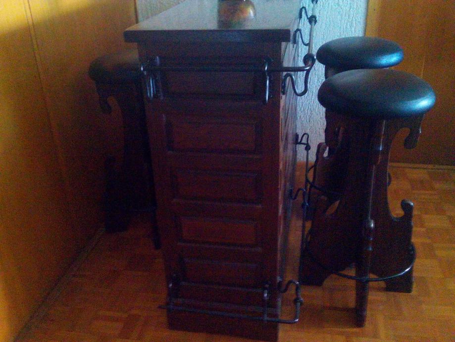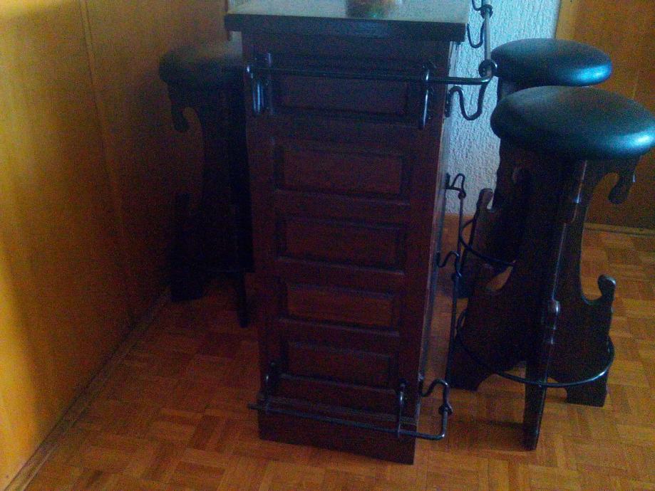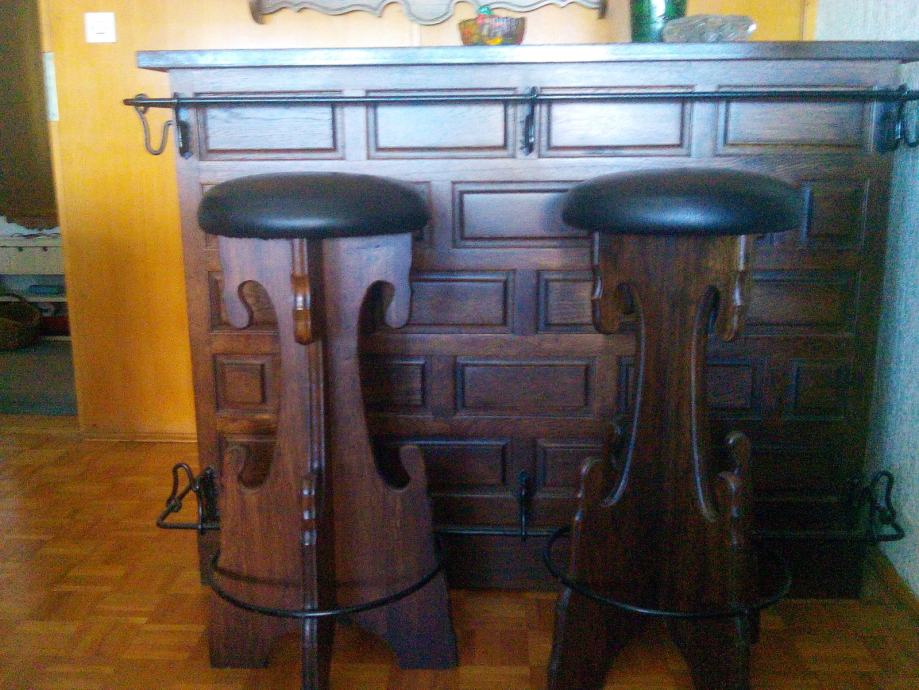 Komplet - sobni šank od hrastovine i tri povišene stolice od hrastovine i kože. Dimenzije dužina 140 cm, širina 43, visina100 cm.