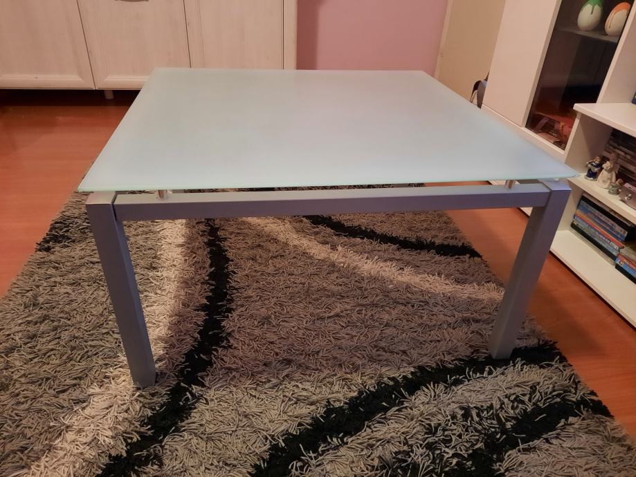 Prodajem stakleni stolić za dnevni boravak kupljen u Domus namještaju u Rijeci. Ploha je od matiranog stakla, dimenzije 75x75 cm, visina 41 cm, super očuvan.