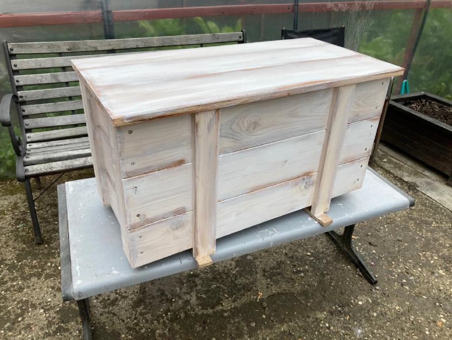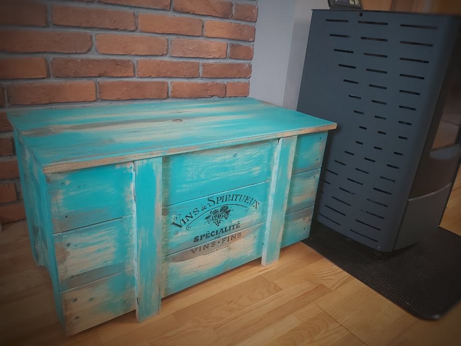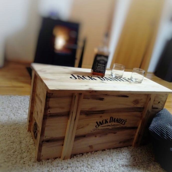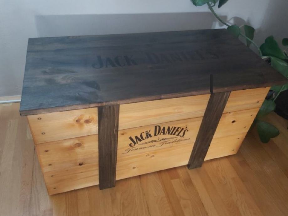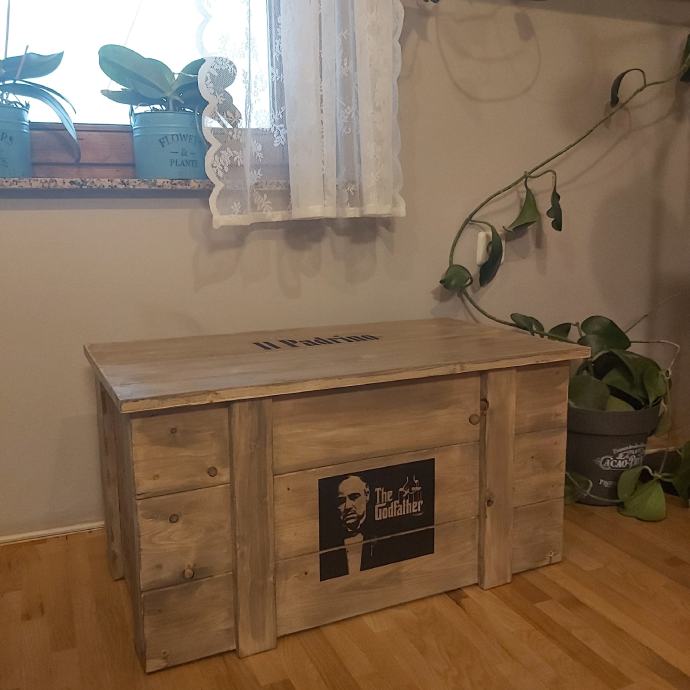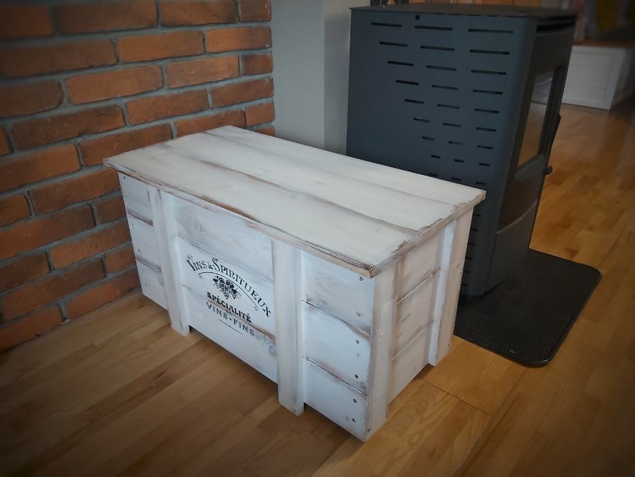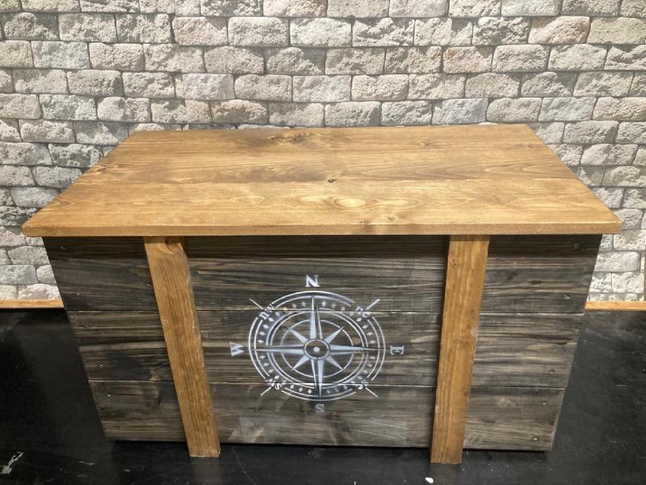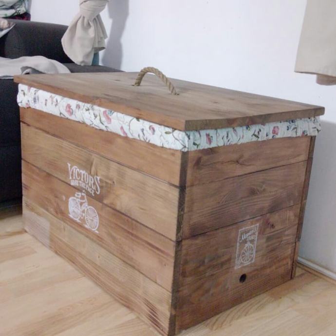Ručno rađeni stolić koji je ujedno i kutija za odlaganje, drvo jelovine s otiskom transfer s papira. Dimenzije 43x80x46 cm.