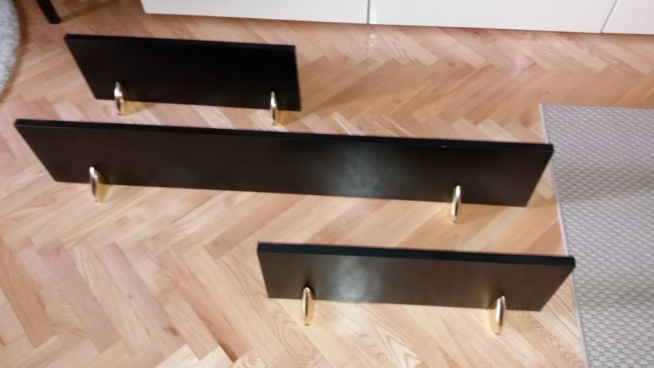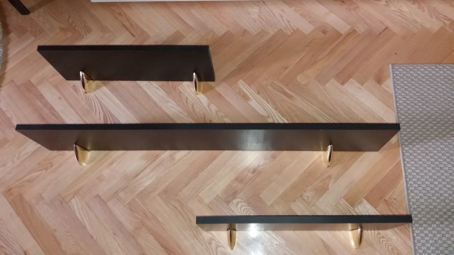 Prodajem u kompletu tri zidne police kao nove sa nosačima dimenzija 55 x 20 cm 2 kom. i 110 x 20 cm 1 kom. Cijena sa montažom 250 kn bez montaže 200 kn.