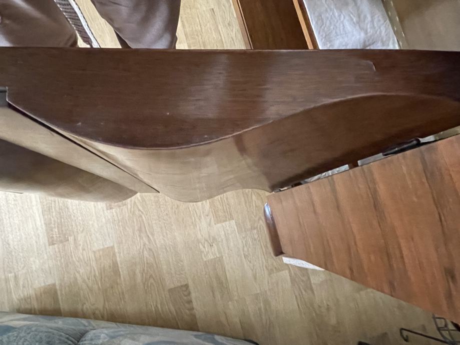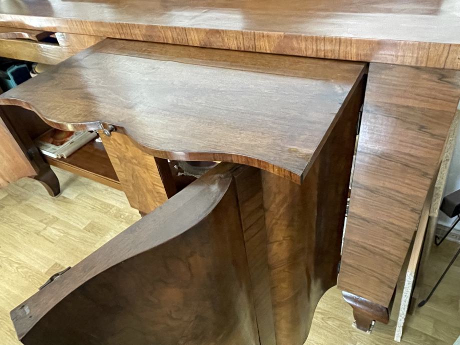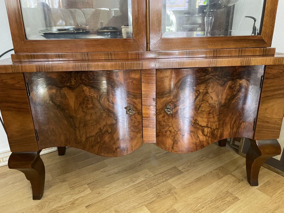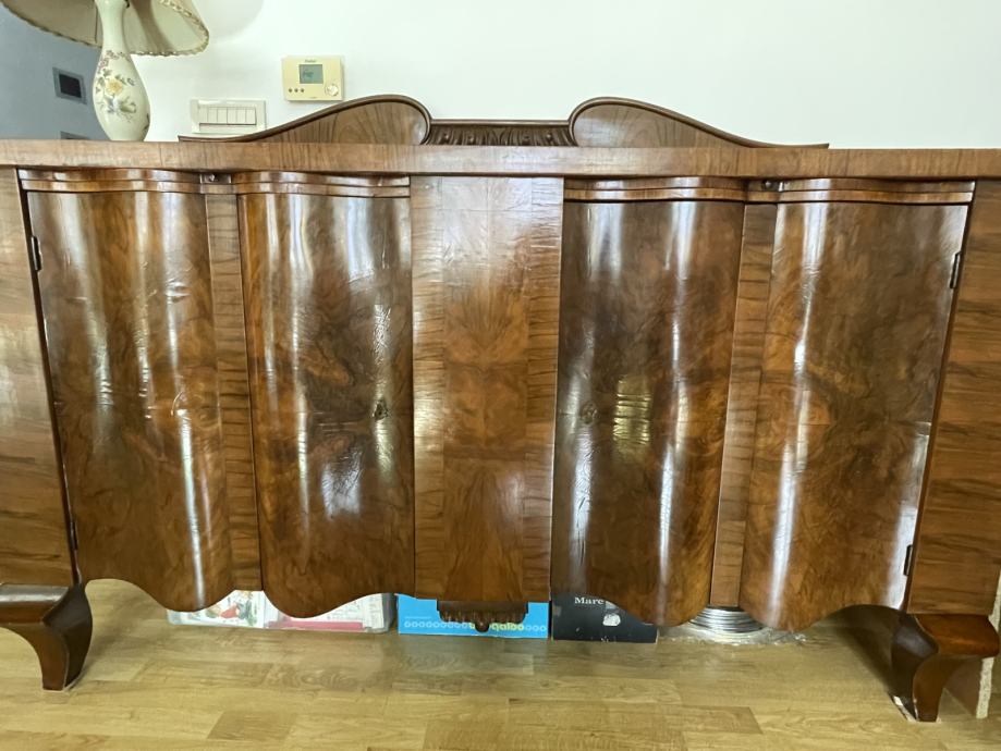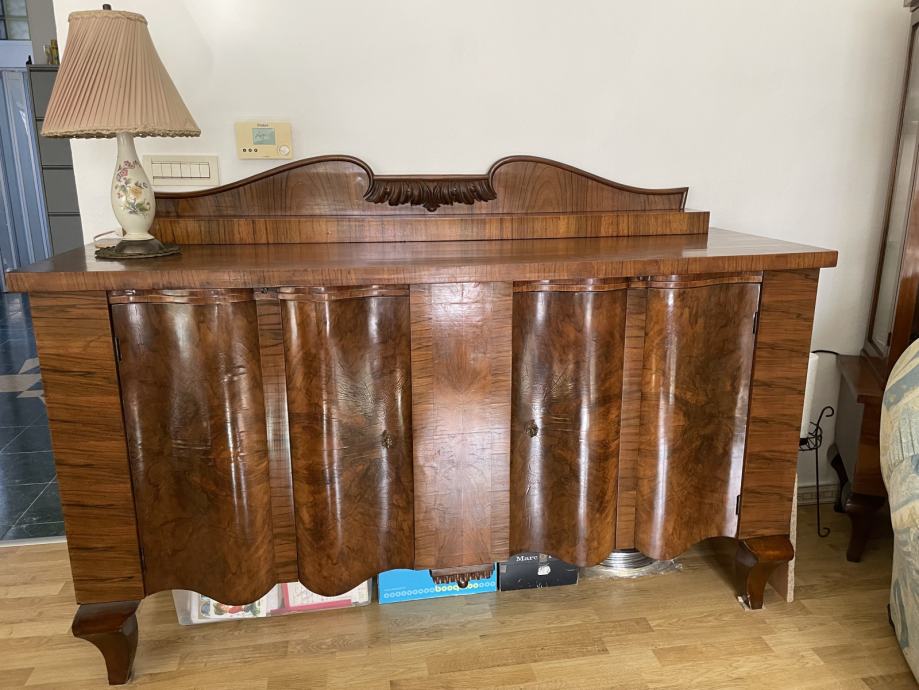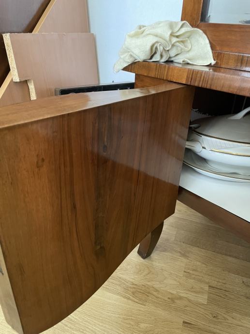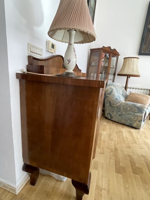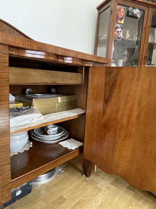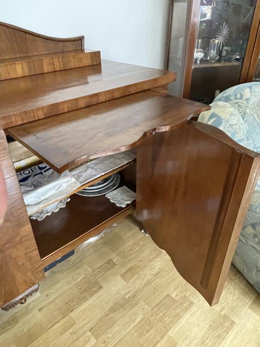 Veliki kredenc: visina = 102cm + 25cm(stražnji dio), dužina = 185cm + 4cm(izbočene noge), širina = 60cm + 4cm(izbočene noge), ima i 2 stola za izvlači