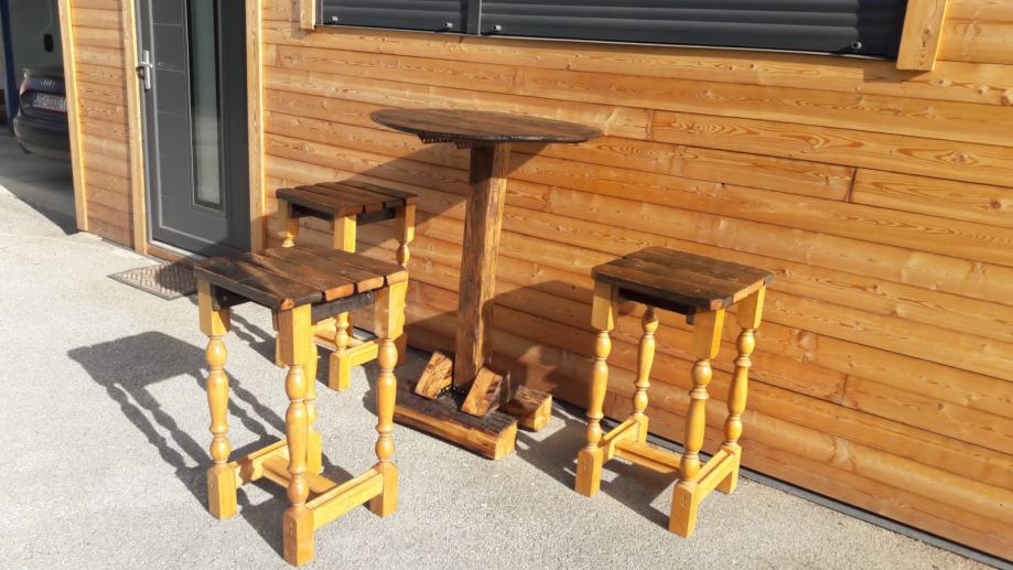 Stol od hrastove bačve stare 50 godina i hrastovih greda, promjer 80 cm.