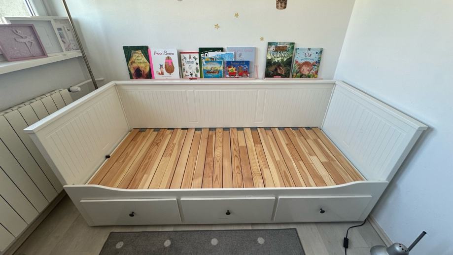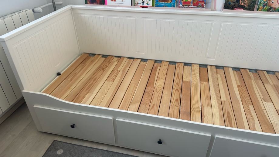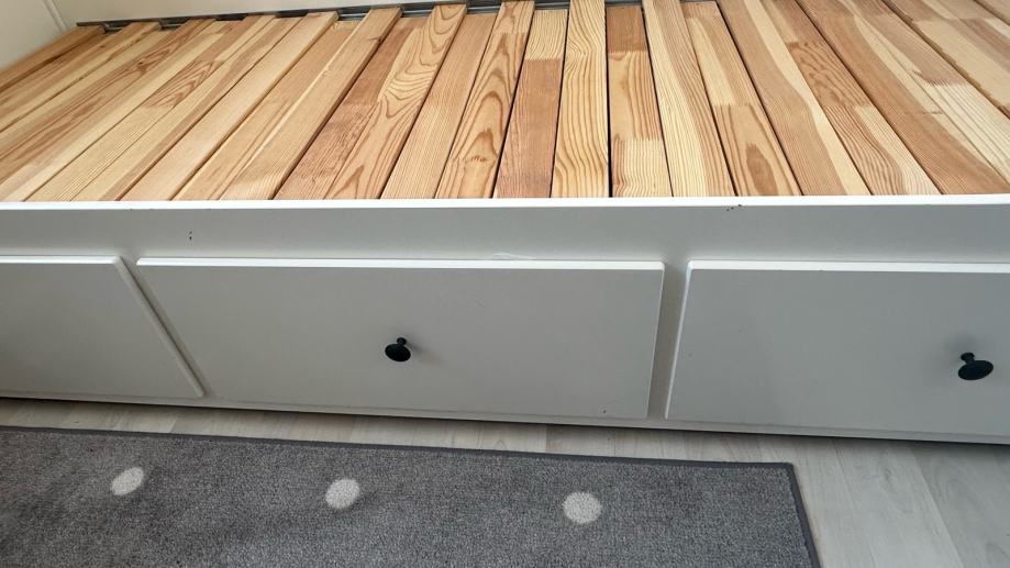 Prodajem Ikea Hemnes krevet u bijeloj boji. Radi se o modelu s tri ladice za odlaganje ispod ležaja, što ga čini praktičnim za pohranu. Krevet ima karakteristični dizajn s letvicama od punog drveta i visokim uzglavljem i bočnom stranom. Vrlo malo spavano na njemu, iskljucivo za goste. Minimalno ostecenje (mala rupica) vidljivo na zadnjoj slici. Ukoliko želite poklanjamo i dva starija madraca s njime. Krevet će biti rastavljen sa svim dijelovima i spreman za transport.