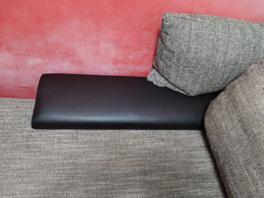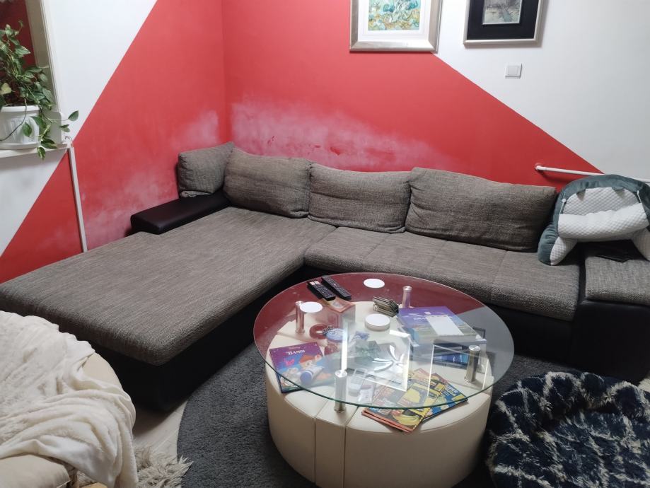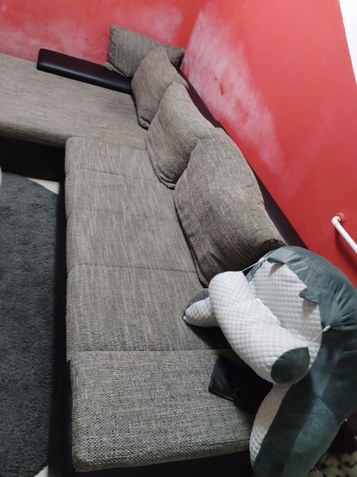Prodajem kutnu garnituru staru 2 godine sa jastucima, jako dobro ocuvanu, kombinacija eko koze u odlicnom stanju I tkanine. Dimenzije 215x310, lijevi kut, mogucnost razvlacenja u lezaj. Potrebno ju je samo malo oprati