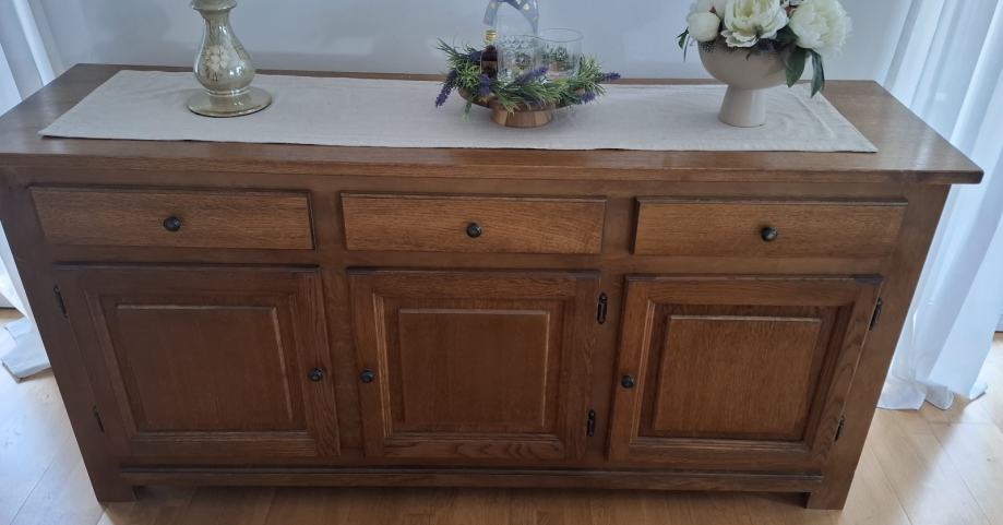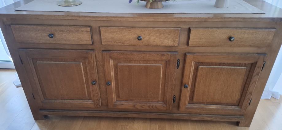 Komoda od masivnog hrastovog drveta. Vrata od punog hrastovog drveta, korpus furniran sa hrastovinom. Očuvano.