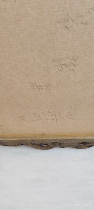 Na poleđini se vide i originalni proračuni koje je vjerojatno radio majstor u tijeku proizvodnje.Podatke smo saznali od obitelji koju smo kontaktirali na osnovu podataka koji su vidljivi na poleđini okvira za ogledalo.