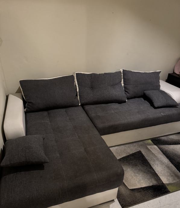 Kutna garnitura ukupne širine 245cm, dubina damskog ležaja 165cm, širina 95cm, dubina dvosjeda 95cm. Garnitura je čvrsta, ima ležaj za spavanje i sanduk za posteljinu. Manja oštećenja na kutevima i jastucima.